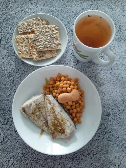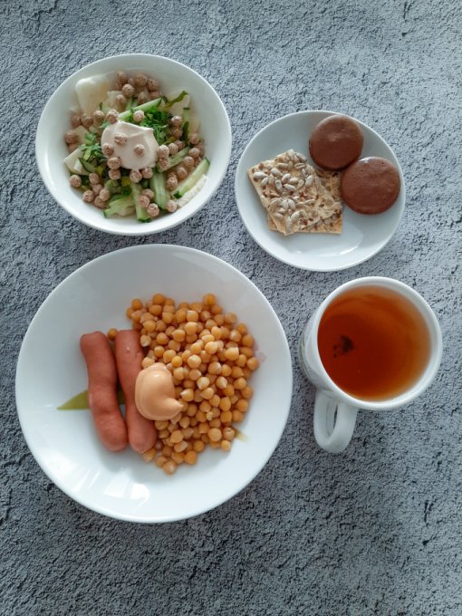• Ужин: 2 сосиски вареные, нут вареный с соусом Американский бургер, салат (капуста белокочанная, огурец, зелень, сметана, отруби гречневые), чай травяной, печенья Идеал с семенами подсолнечника, льна и кунжута, 2 Макаруны шоколадных.