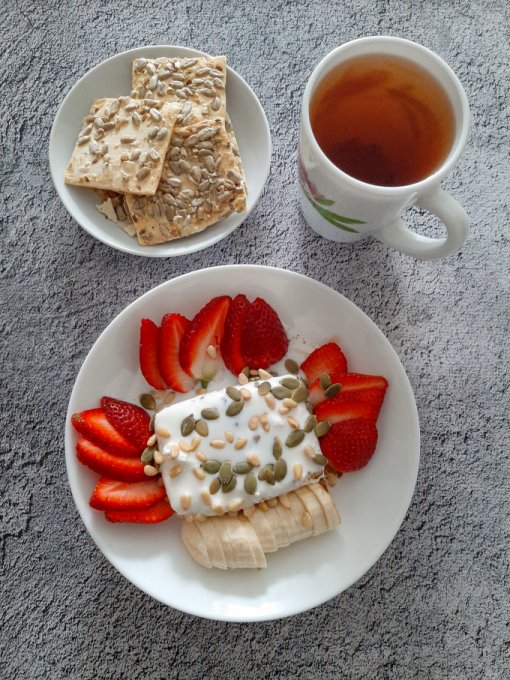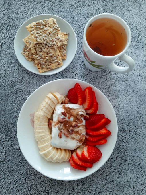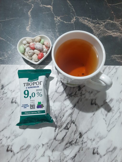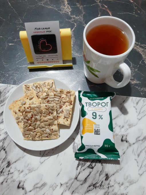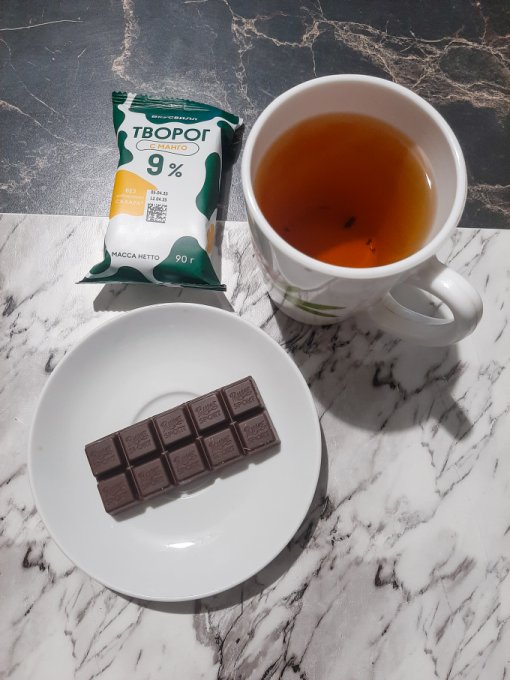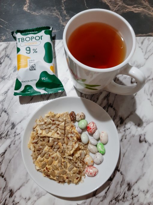 • Перекус: чай травяной, творог с манго без сахара, печенья Идеал с семенами подсолнечника, льна и кунжута, драже арахис в шоколадной глазури.