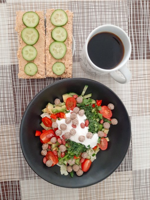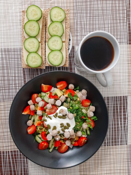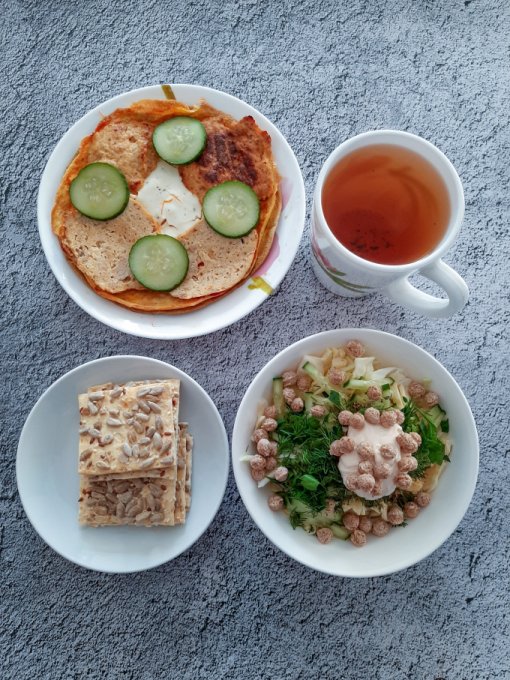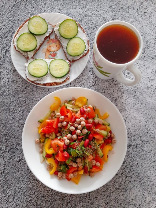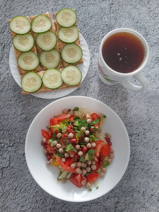 • Завтрак: салат (томат, огурец, желтый болгарский перец, пекинская капуста, сельдерей, авокадо, льняное масло, яблочный уксус, зелень, арахис жареный, отруби гречневые), цикорий, 3 кусочка хлеба с семечками с творожным сыром и огурцом.