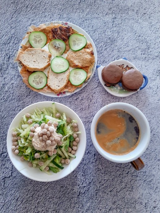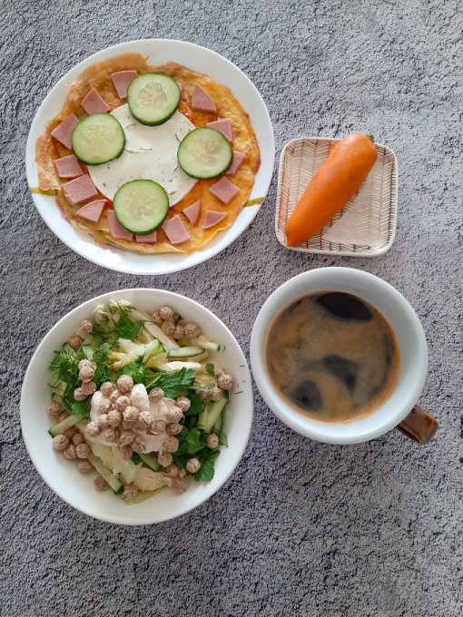 • Обед: салат (капуста белокочанная, огурец, зелень, сметана, отруби гречневые), тортилья пшеничная со шпинатом, жареным яйцом С0 на кокосовом масле с кетчупом, творожным сыром, котлетой Домашней и огурцом, кофе черный, 2 Макарони шоколадных.