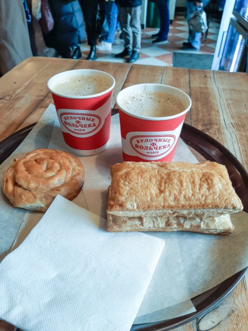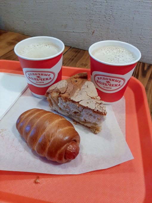 • Перекус в кафе: кофе с молоком, сосиска в тесте.