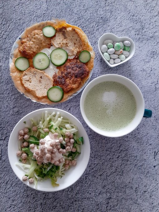 • Обед: салат (капуста белокочанная, огурец, зелень, сметана), котлета Домашняя, пюре из цветной капусты на сметане, флэт на коровьем молоке, тортилья пшеничная со шпинатом, творожным сыром и огурцом, конфета шоколадная Папа Коля.