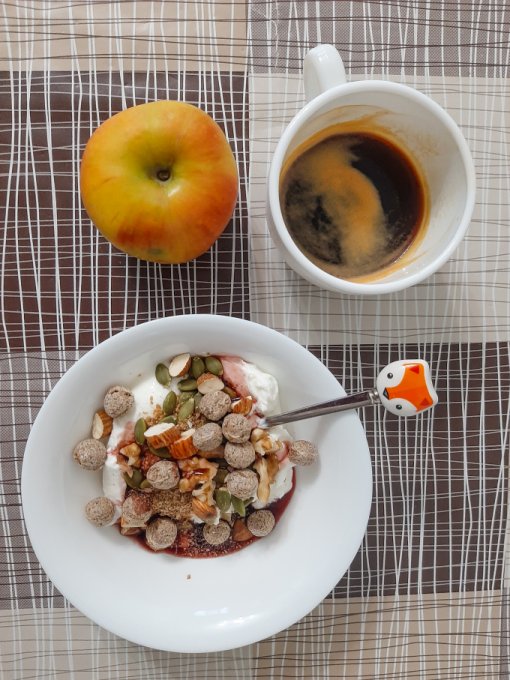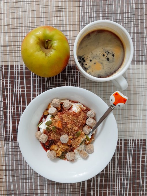 • Перекус: кофе черный, мягкий творожок с отрубями, тыквенными семечками, миндалем, грецкими орехами, низкоуглеводным сиропом со вкусом вишни, яблоко.