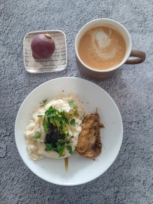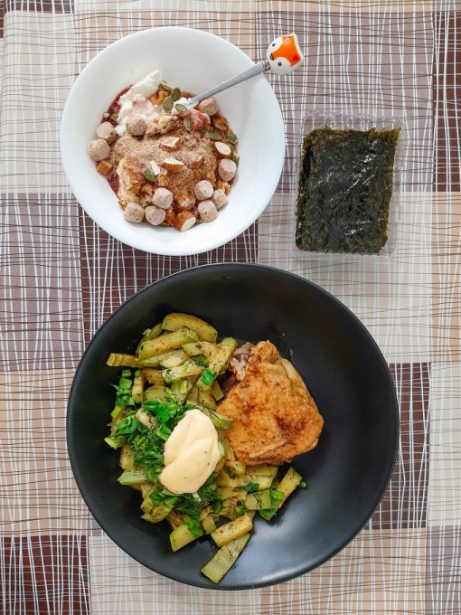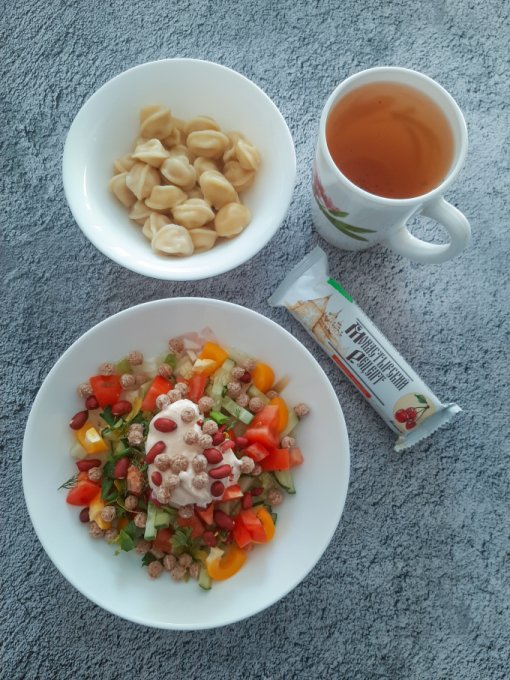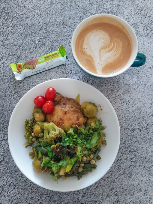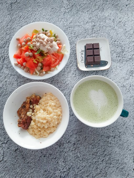 • Обед: куриное бедро, птитим, салат (капуста белокочанная, томат, петрушка, сметана, отруби гречневые), матча на растительном молоке из сои и кешью, шоколад Риттер Спорт 74% какао.