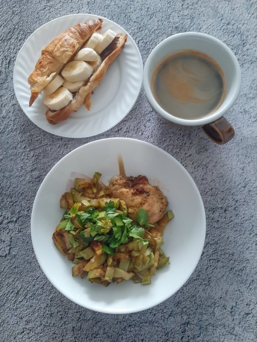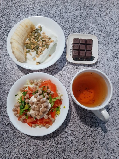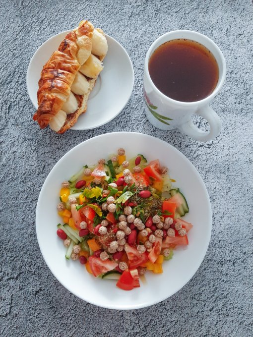 • Завтрак: салат (томат, огурец, желтый болгарский перец, пекинская капуста, сельдерей, льняное масло, яблочный уксус, зелень, арахис жареный, отруби гречневые), цикорий, круассан с Шоколадной арахисовой пастой и бананом.