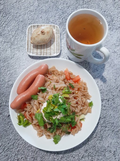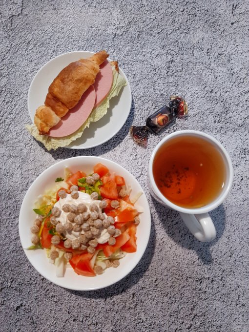 • Ужин: салат (капуста белокочанная, томат, петрушка, сметана, отруби гречневые), чай травяной, круассан с пекинской капустой и колбасой Докторской, конфета шоколадная Эспрессо со вкусом кофе.