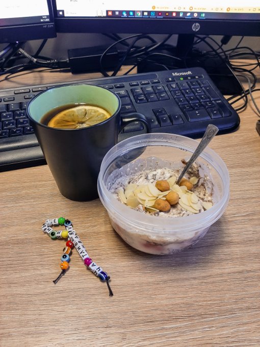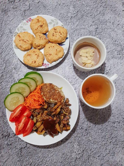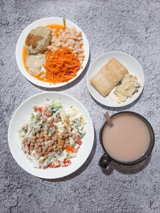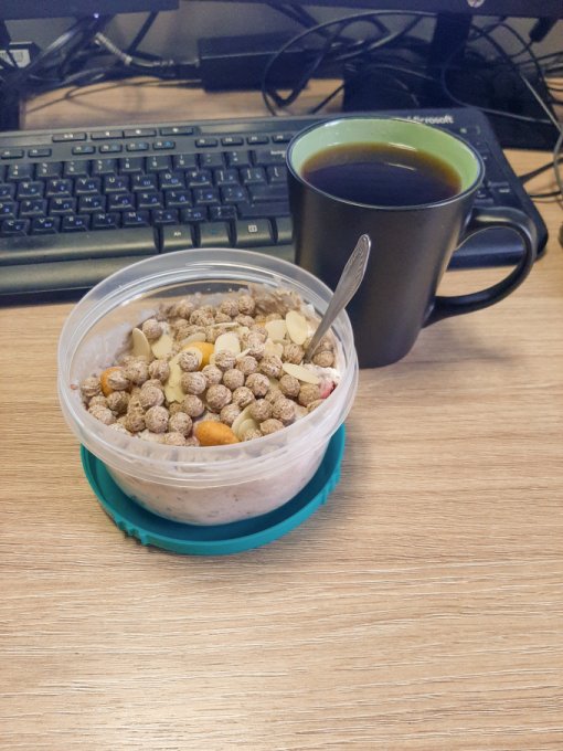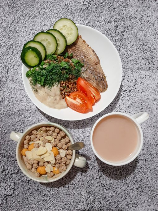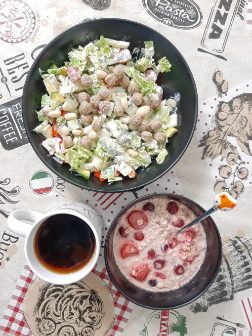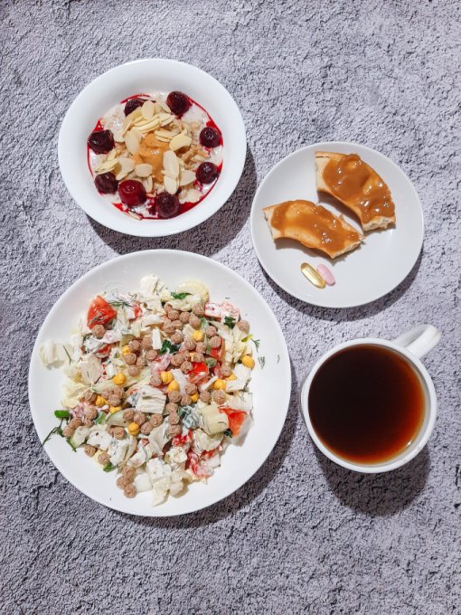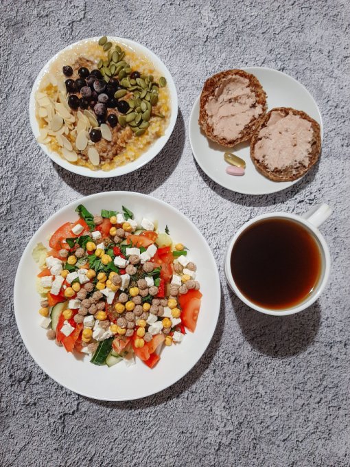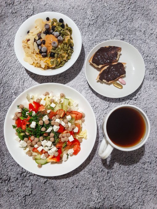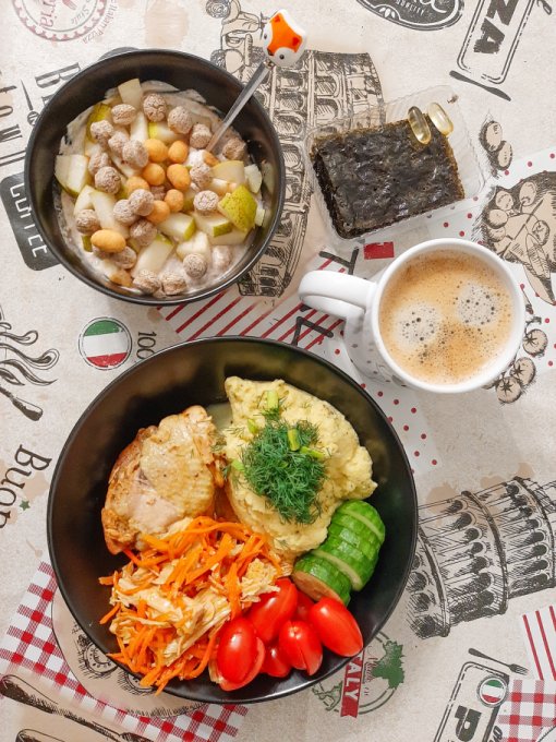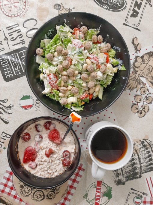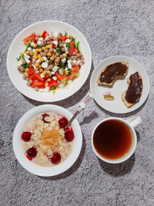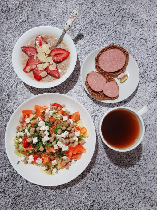 • На завтрак салат (помидор, огурец, красный болгарский перец, пекинская капуста, сельдерей, зелень, сыр брынза, отруби), цикорий, каша из овсянки и перловки на козьем молоке с арахисовой пастой, шоколадным соусом, клубникой и миндальными лепестками, булочка с колбасой.