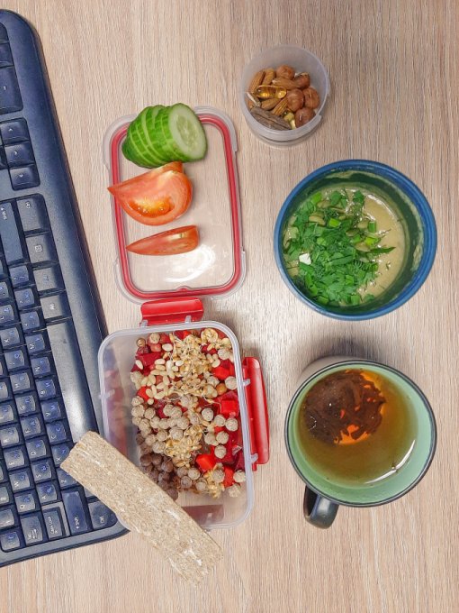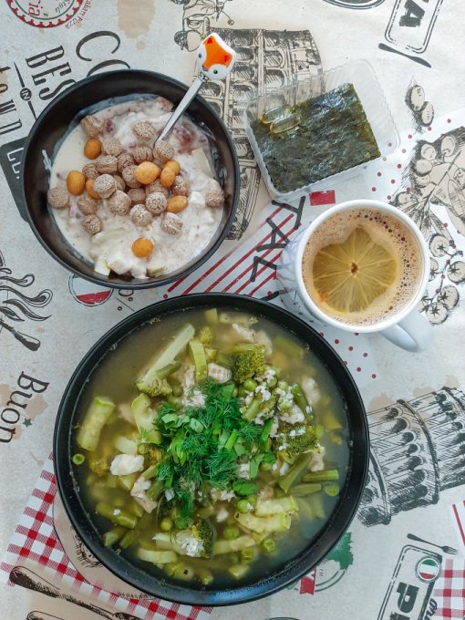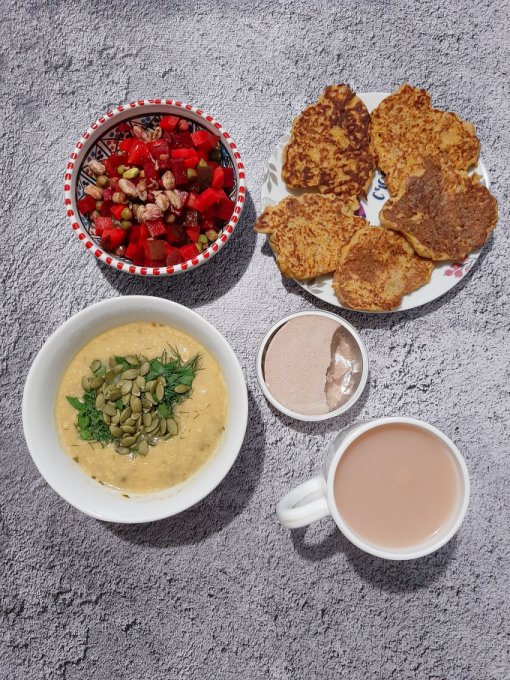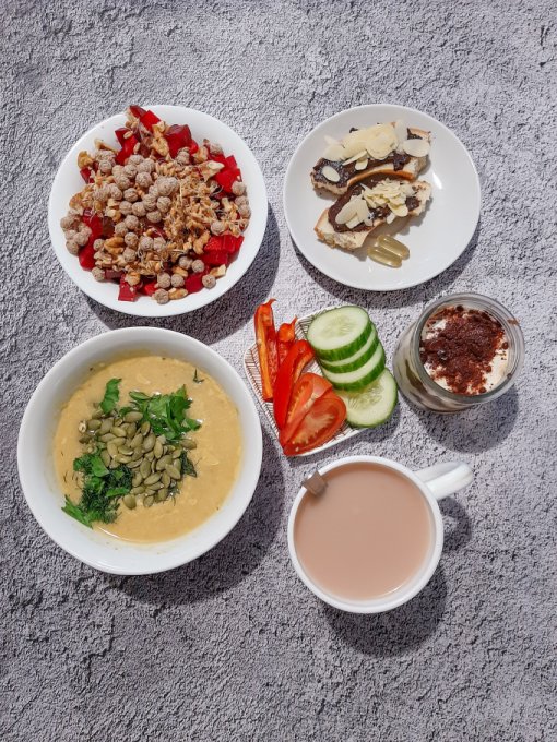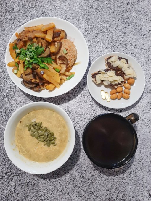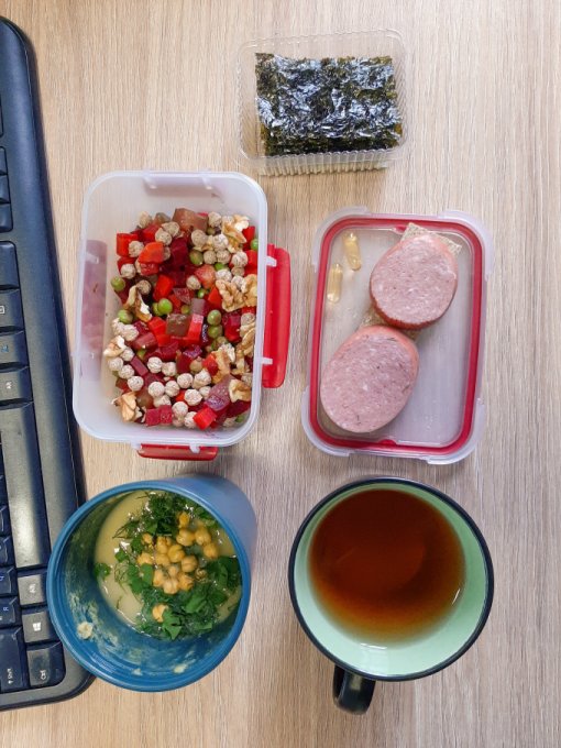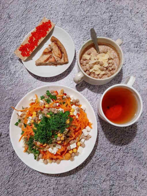 • На обед крем-суп из тыквы с зеленью и жареным нутом, винегрет с оливковым маслом, отрубями и грецкими орехами, чай, чипсы из нори, хлебец с колбасой.