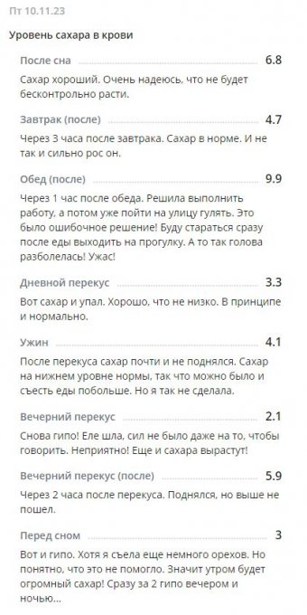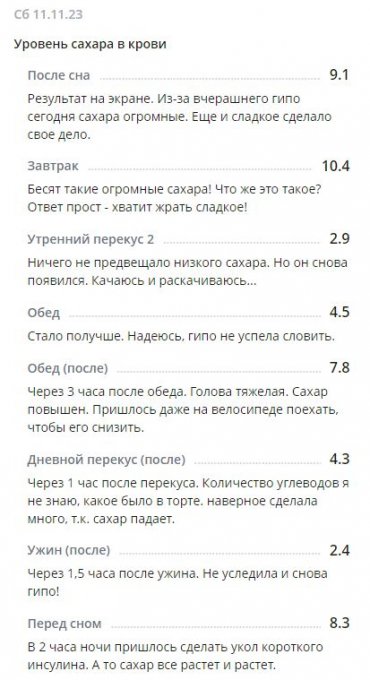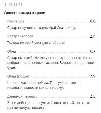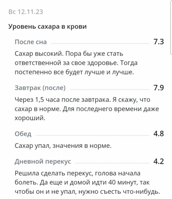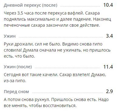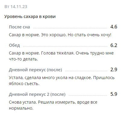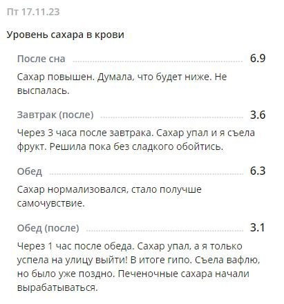 *Сахар в крови. Из-за бублика и пшенной каши с тыквой сахар резко вверх пошел после завтрака. Зато на обед не побоялась и сделала большой укол, чтобы наверняка. В итоге падение… очередное гипо. Потом снова сахар начал расти, даже прогулка никак не помогла, сахар все рос и рос, пришлось сделать 2 дополнительных укола.