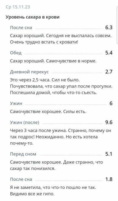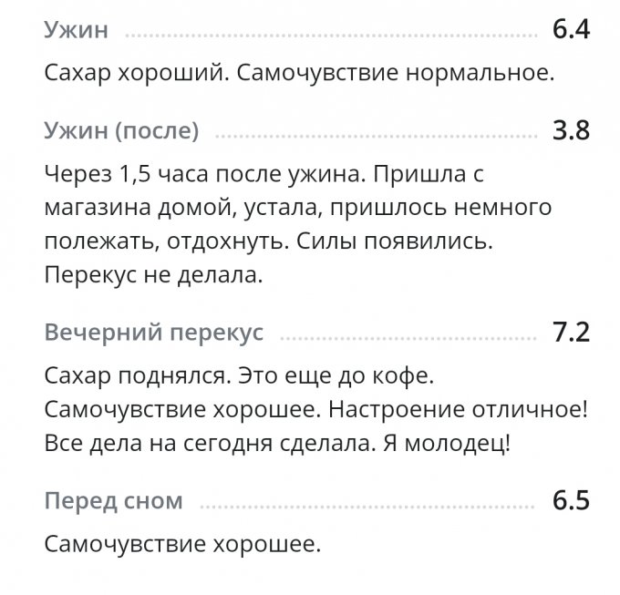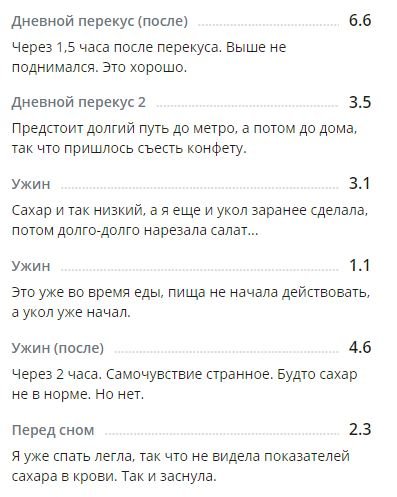 *Сахар в крови. Сегодня сахар более-менее хороший, но зачастую низкий. Перед ужином вообще гипо словила! Это самое неприятное! Остается ожидать в ближайшее время выброса печеночных сахаров.