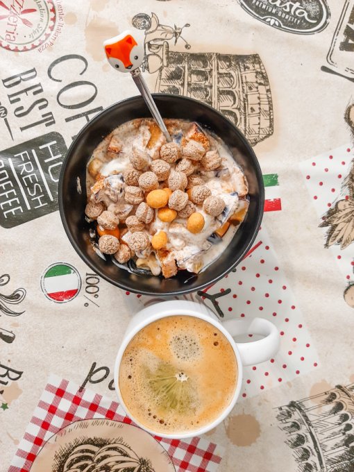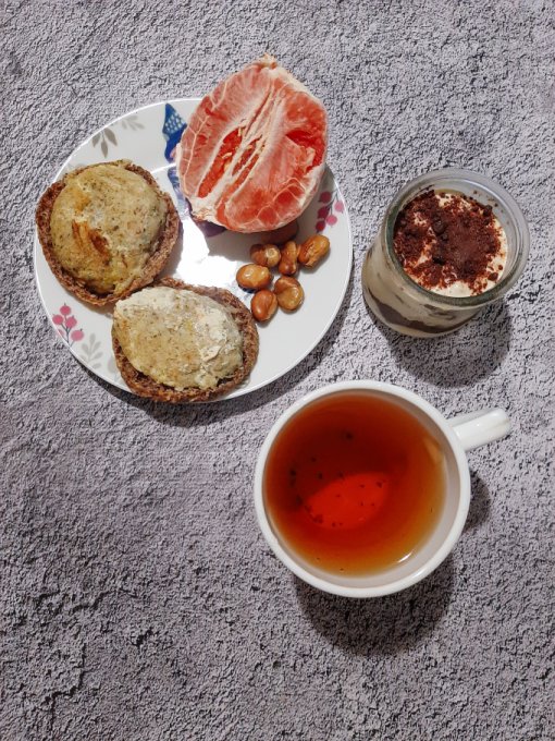 • На перекус кофе черный с лимоном, мягкий творожок на ряженке с отрубями, семенами чиа, кокосовой стружкой, шоколадным соусом, семечками подсолнечника, жареным нутом, миндальными лепестками, арахисом в глазури, вишней.