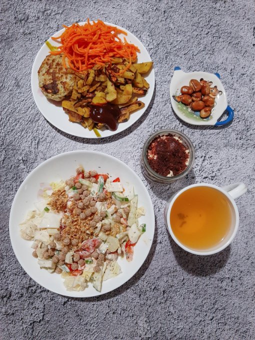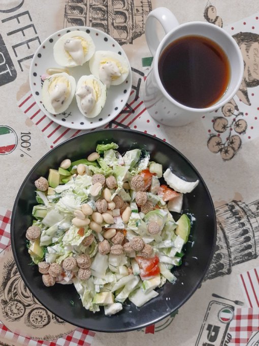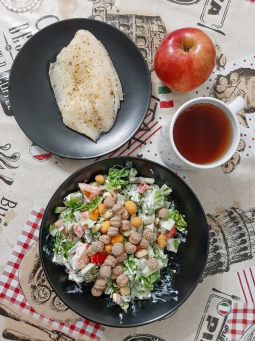 • На ужин салат (салака горячего копчения, помидор, огурец, красный болгарский перец, пекинская капуста, сельдерей, оливковое масло, яблочный уксус, овсяные отруби, нут жареный, арахис в глазури, пророщенная пшеница, сыр брынза), чай травяной, хлебец с имитированной икрой из морских водорослей, шарлотка с яблоками, ряженка с отрубями, семенами чиа, семечками подсолнечника, тыквенными семечками, кедровыми орехами, шоколадным соусом, черной смородиной, миндальными лепестками, подсолнечным протеином.