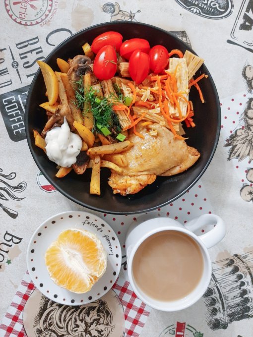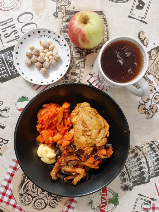 • На обед салат Столичный со сметаной, сок из граната, кабачок с соевым соусом, куриная ножка в кокосовой панировке, чай с облепихой, тарталетка с клубникой, чизкейк Арахисовый кранч, пирожное Черная смородина.