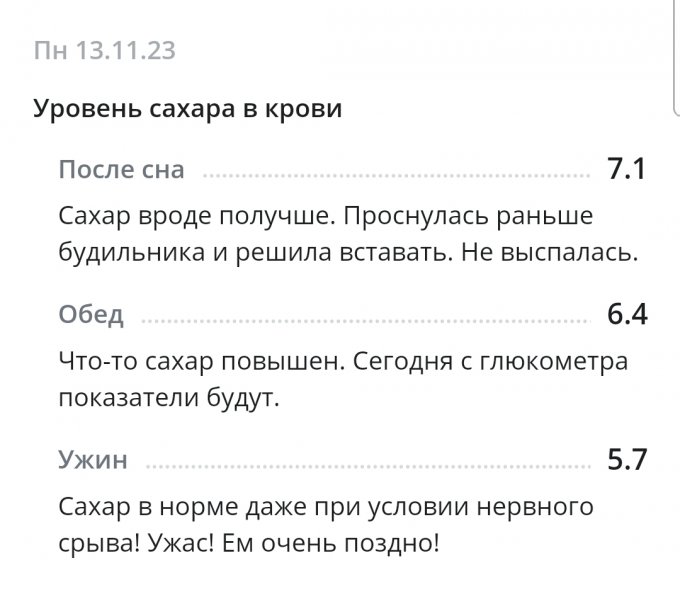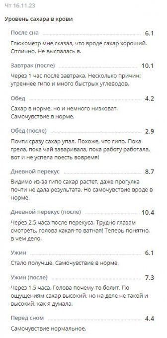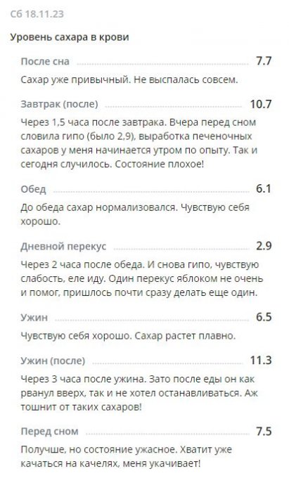 *Самочувствие. Особенно ужасно себя чувствовала после ужина. Сахар все полз вверх и полз! До тошноты не дошло, но именно такое ощущение в горле меня сопровождало весь вечер.
