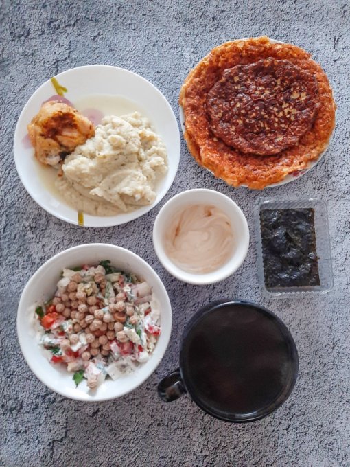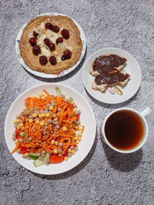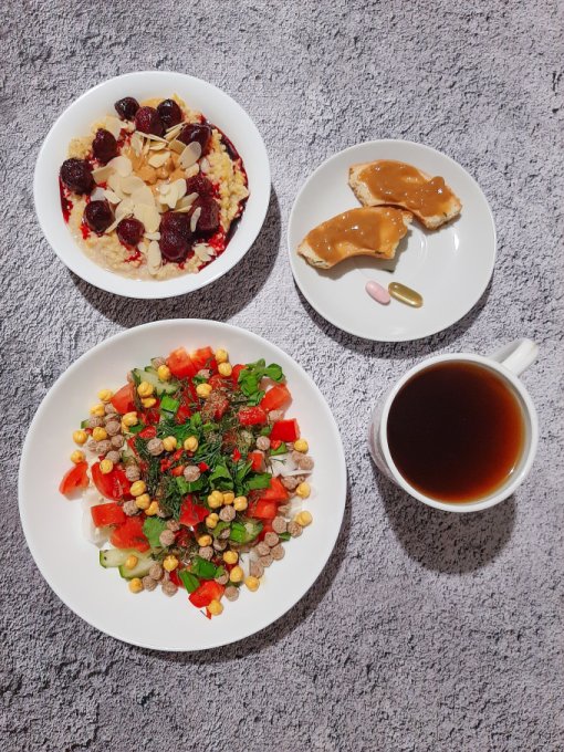 • На завтрак салат (помидор, огурец, красный болгарский перец, пекинская капуста, сельдерей, зелень, льняное масло, яблочный уксус, отруби, нут жареный), цикорий, пшенная каша с тыквой, арахисовой пастой, вишней и миндальными лепестками, бублик с карамельным соусом.