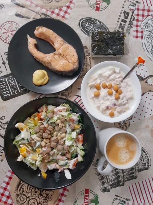 • На ужин форель с медово-горчичным соусом, салат (помидор, огурец, желтый болгарский перец, пекинская капуста, зелень, сметана, отруби, арахис), кофе черный, чипсы из нори, мягкий творожок на кефире с грушей, малиновым джемом, арахисом в глазури, арахисом.