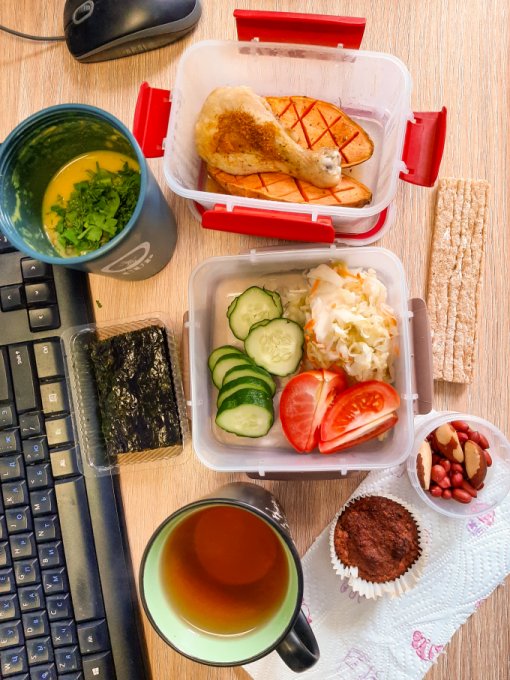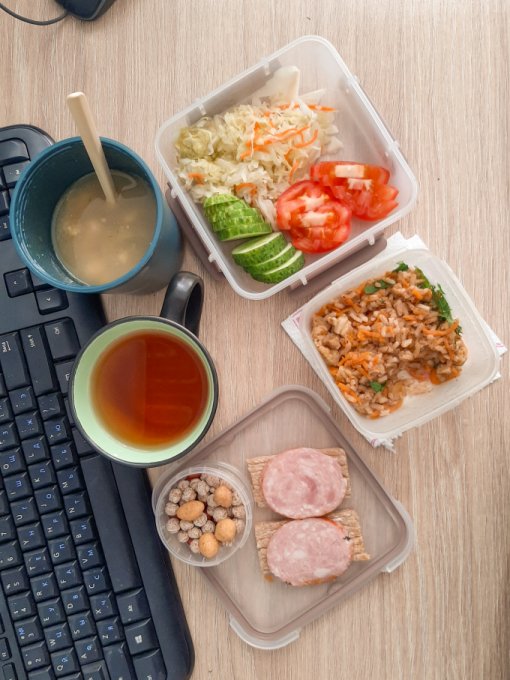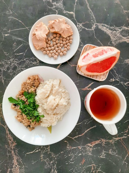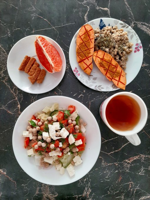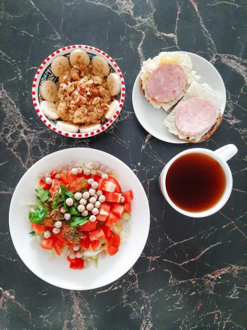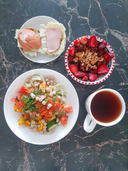 • На завтрак салат (помидор, огурец, жёлтый болгарский перец, пекинская капуста, сельдерей, зелень, льняное масло, яблочный уксус, отруби), цикорий, каша из овсяной крупы с клубникой, кэробом и грецкими орехами, булочка с пекинской капустой и колбасой варёной молочной.
