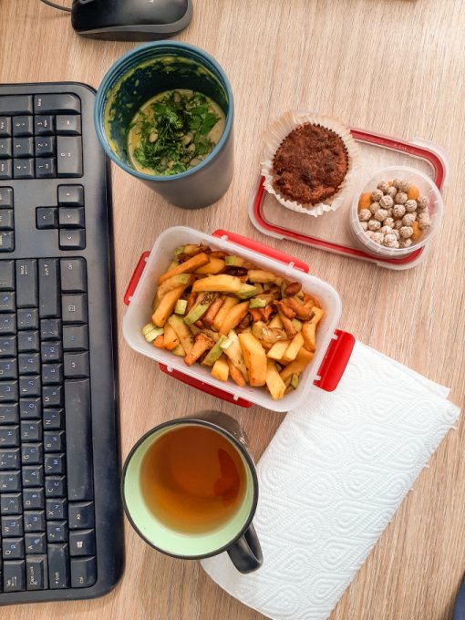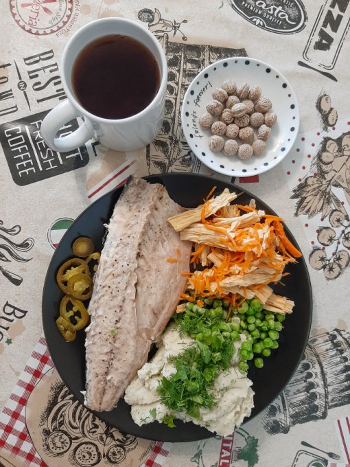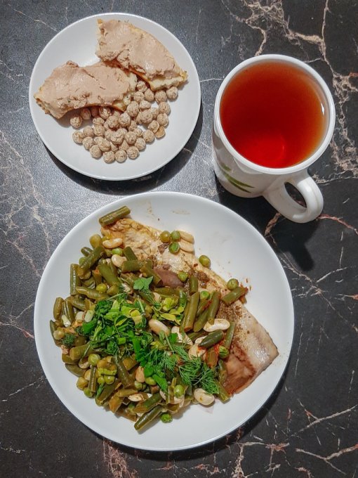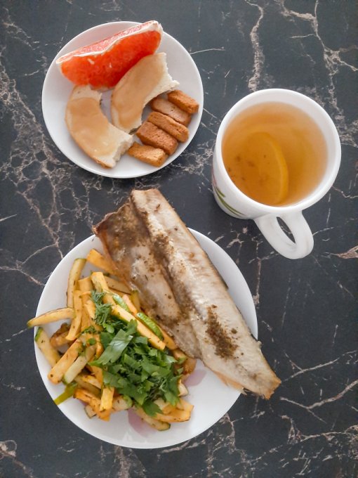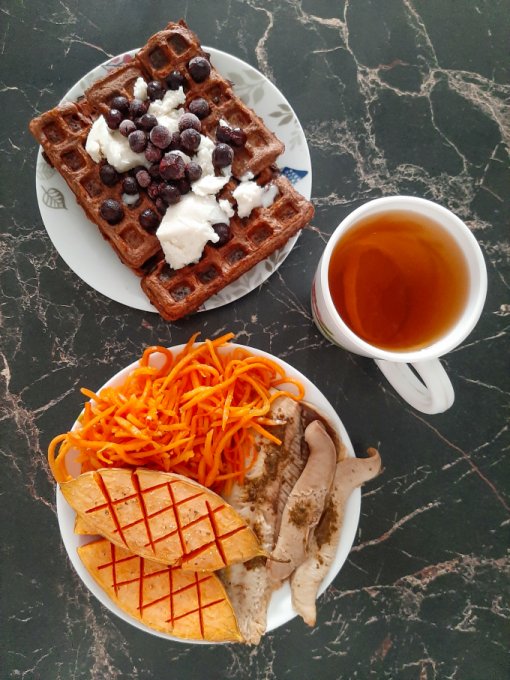 • На ужин сельдь, морковь по-корейски, батат, чай травяной с лимоном, вафли из черёмуховой и соевой муки с кокосовой пастой и чёрной смородиной.