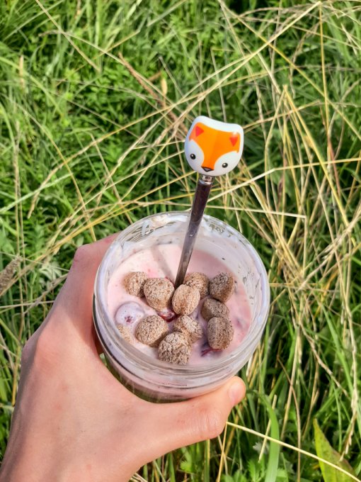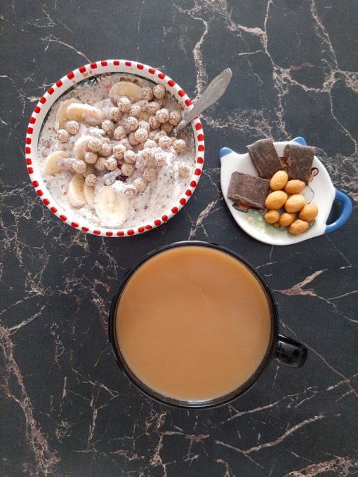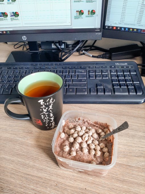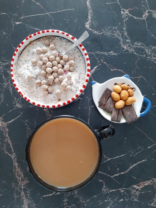 • На перекус чай, мягкий творожок на ряженке с отрубями, семенами чиа, кокосовой стружкой, арахисом, какао-порошком, кленовым сиропом и джемом из черники.