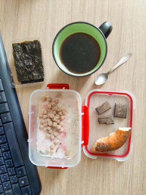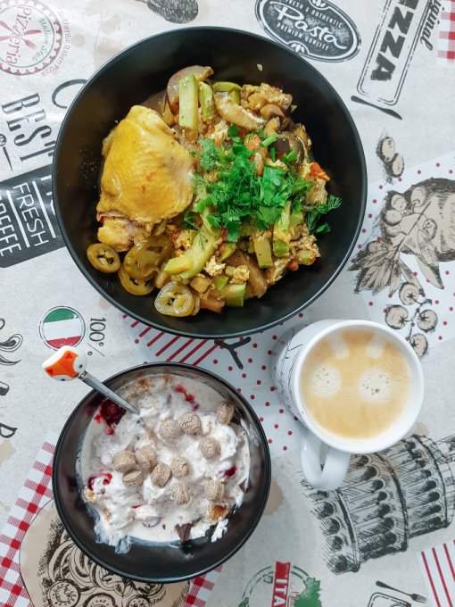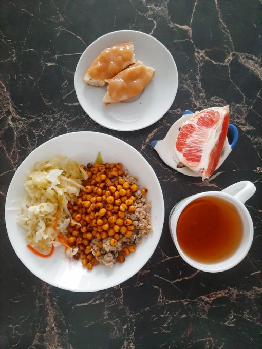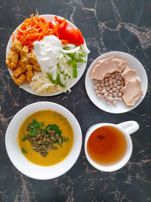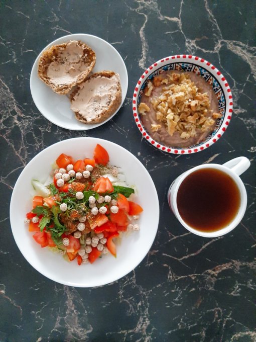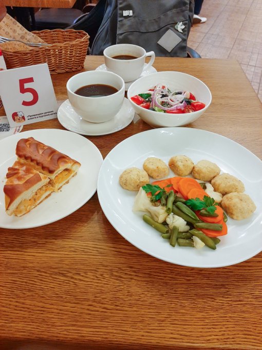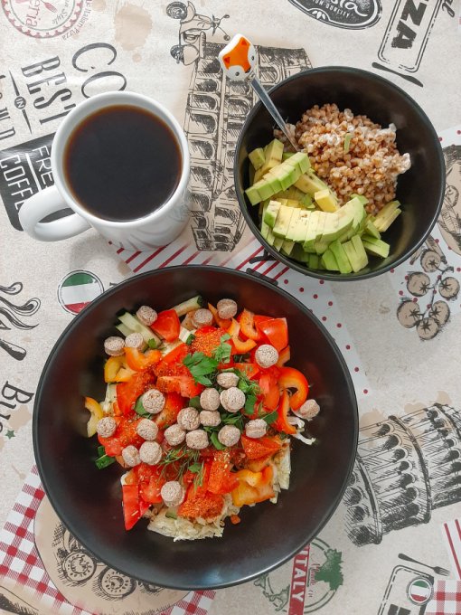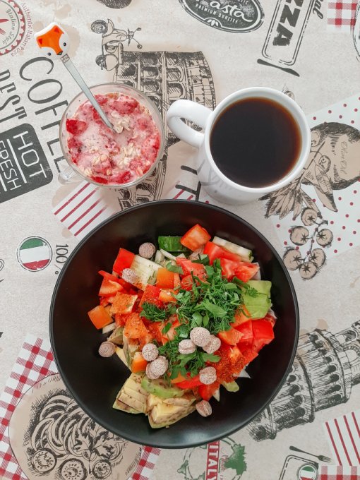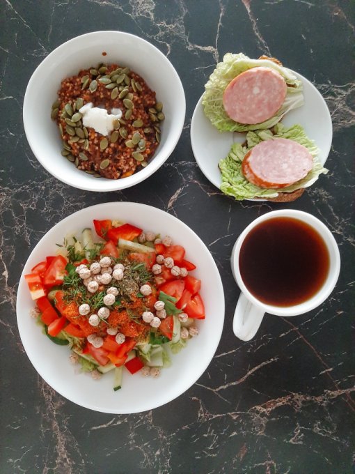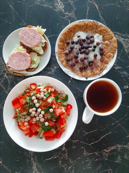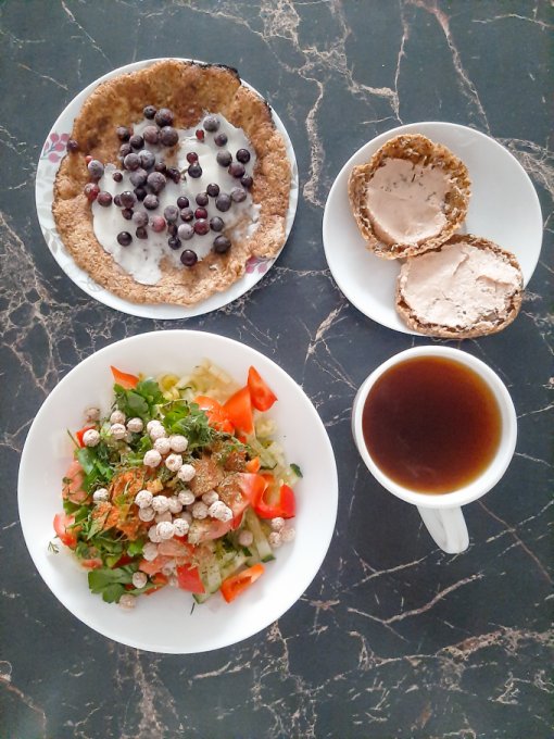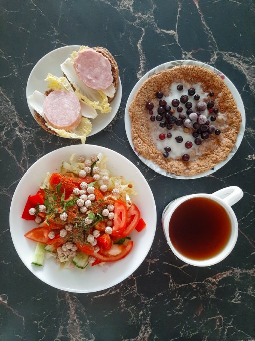 • На завтрак салат (помидор, огурец, красный болгарский перец, пекинская капуста, сельдерей, зелень, льняное масло, яблочный уксус, отруби), цикорий, овсяный блин с кокосовой пастой и чёрной смородиной, булочка с пекинской капустой и полукопчёной колбасой.