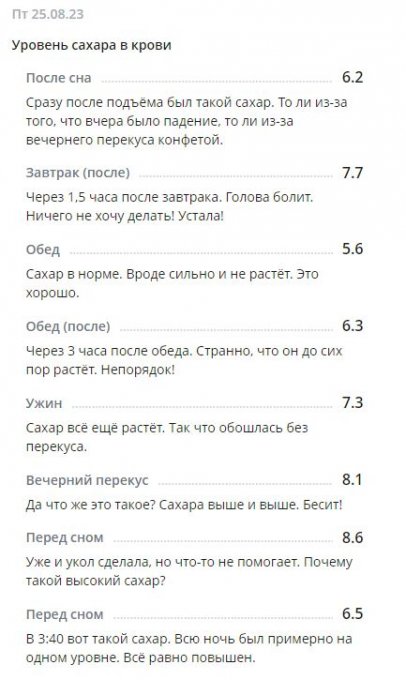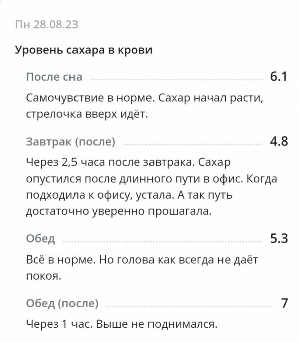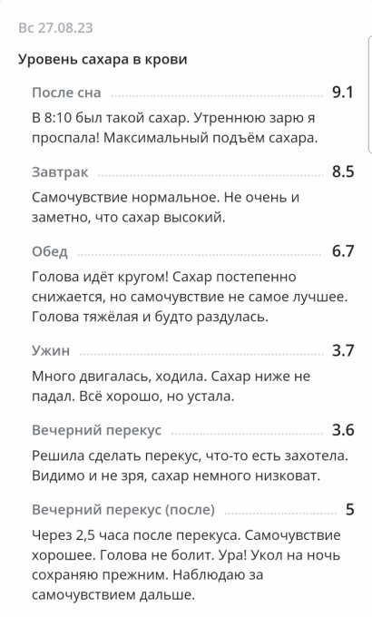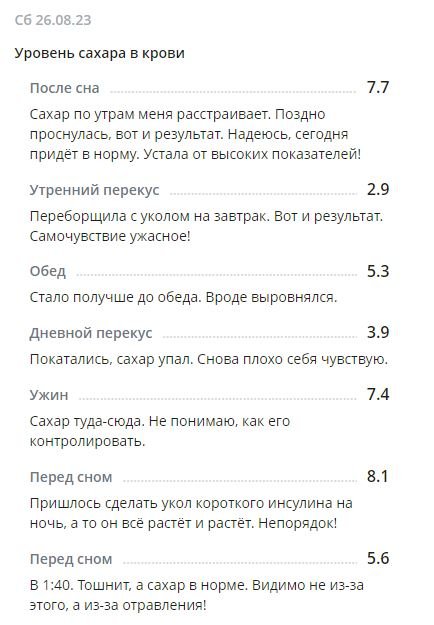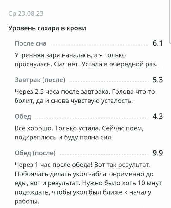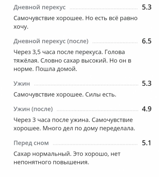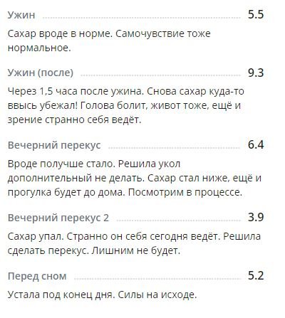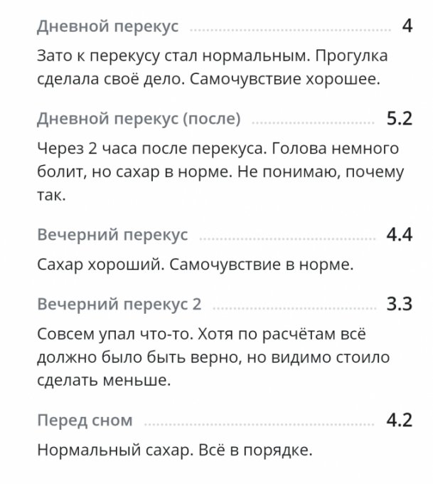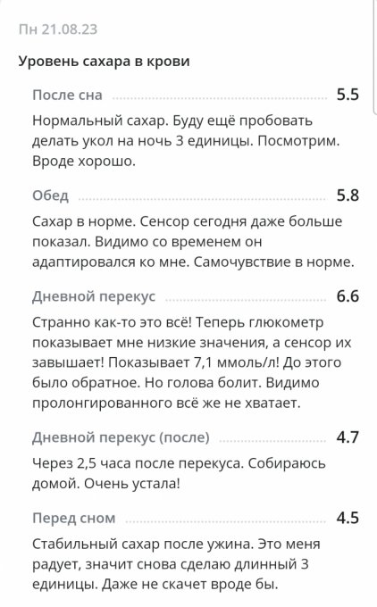 *Сахар в крови. Что-то не очень. Много ошибок сделала за сегодня. В итоге гипо было дважды за день. Завтра ожидаются неконтролируемые сахара…