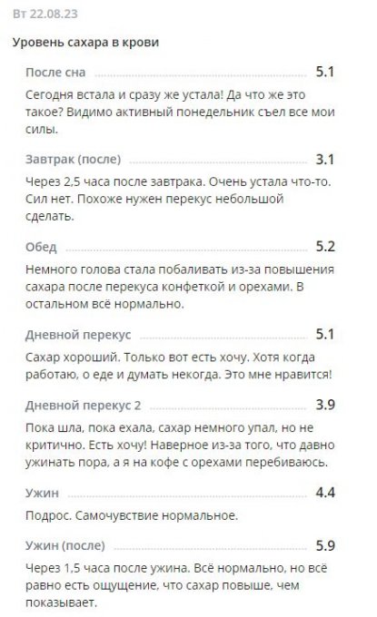 *Сладкое. Утром из-за низкого сахара пришлось сделать перекус и съесть половинку конфеты. Потом вечером все мысли были о сладком, сахар снова стал падать. Думала, если сегодня не съем ничего, то завтра во время работы побегу в кафе. В итоге не удержалась и съела торт с кофе в кафе, но с уколом прогадала, сделала больше необходимого, поэтому пришлось половинку конфеты доедать по пути. Вот так я сегодня переела сладкого и калорий.