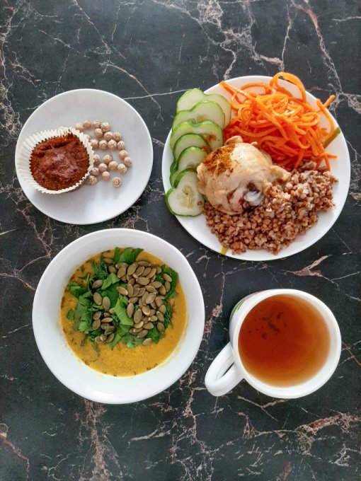 • На обед тыквенный крем-суп с зеленью, морской капустой и тыквенными семечками, кабачок, репа и лисички в соевом соусе с закусочкой по-Тоскански, чай, отруби, арахис в глазури, цитрусовый кекс с маком.