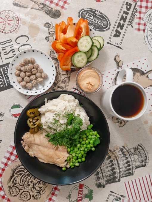 • На ужин салат греческий, рыбные фрикадельки, овощной микс на пару, кофе чёрный, пирог с рыбой.