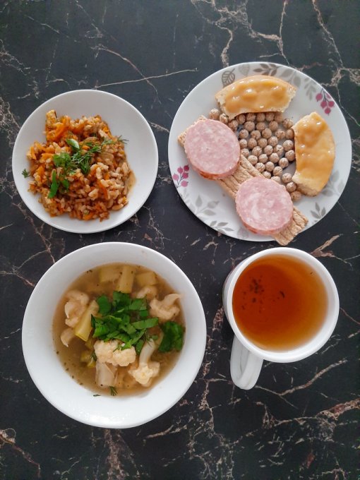 • На обед гороховый суп с морской капустой и зеленью, плов с зеленью, чай травяной, отруби, бублик с сиропом Бейлис, хлебец с полукопчёной колбасой.