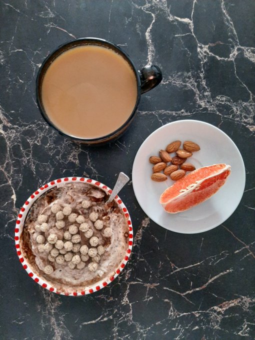 • На перекус кофе со сливками, мягкий творожок на ряженке с отрубями, семенами чиа, кокосовой стружкой, семечками подсолнечника, арахисом жареным, какао порошком, кленовым сиропом и вишней, грейпфрут, миндаль.