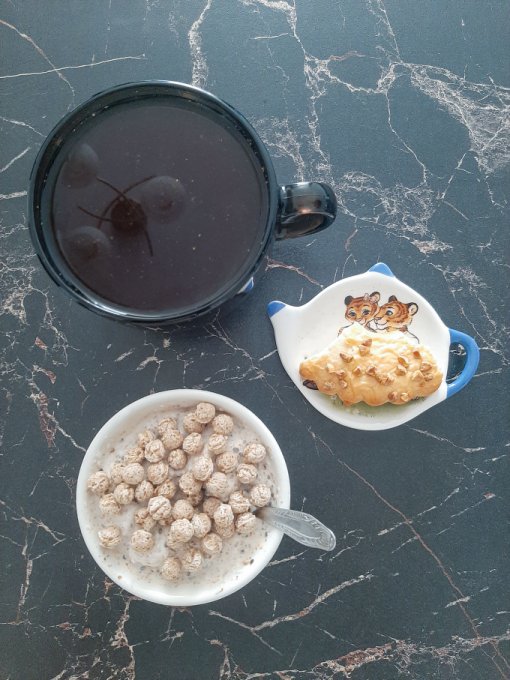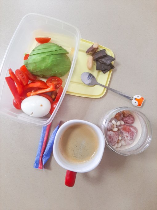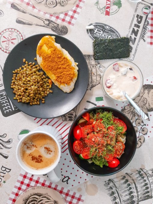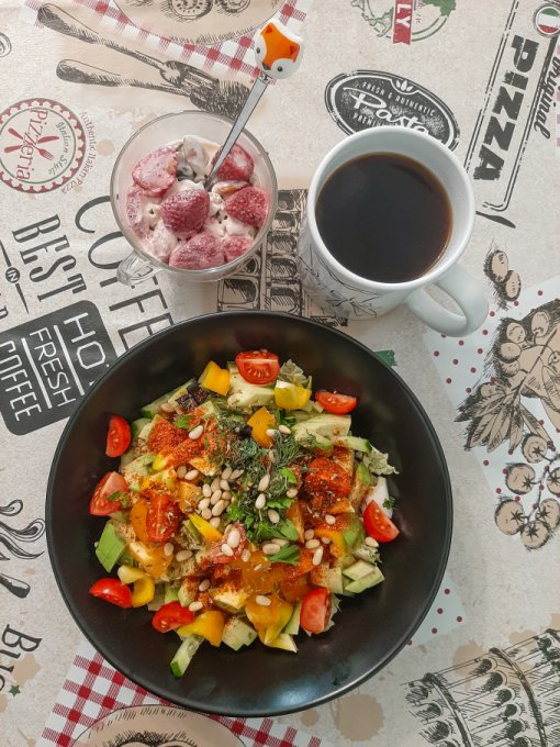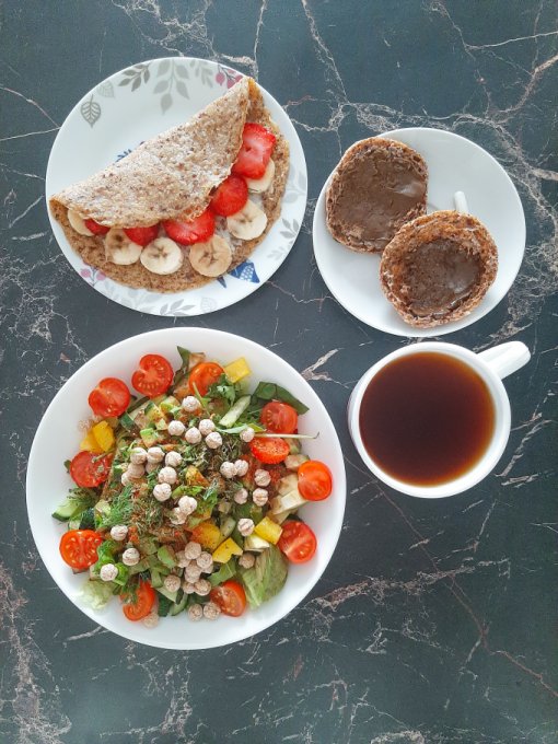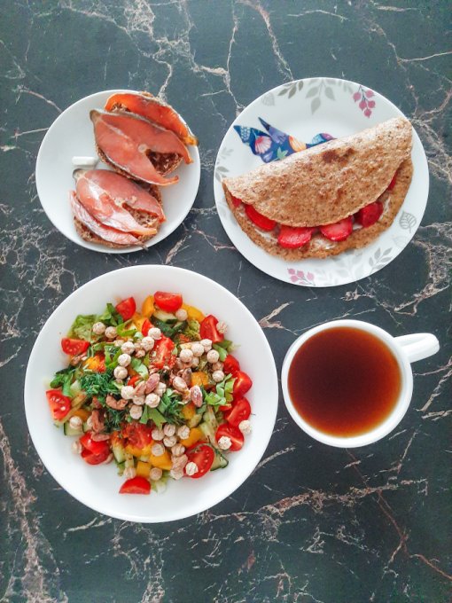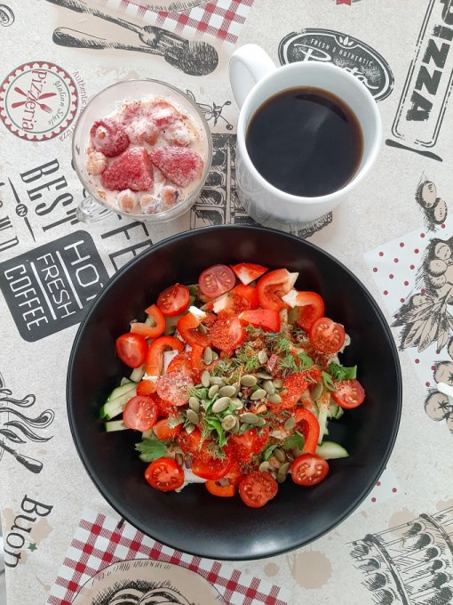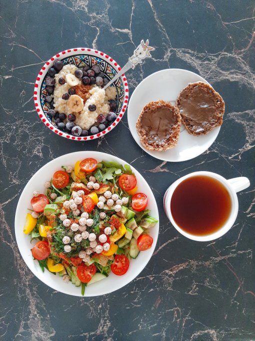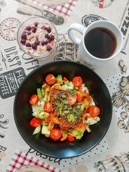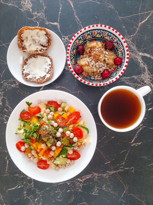 • На завтрак салат (помидор, огурец, жёлтый болгарский перец, пекинская капуста, сельдерей, зелень, оливковое масло, яблочный уксус, отруби), цикорий, каша из киноа и амаранта с вишней и семечками подсолнечника, булочка с шоколадной кокосовой пастой.