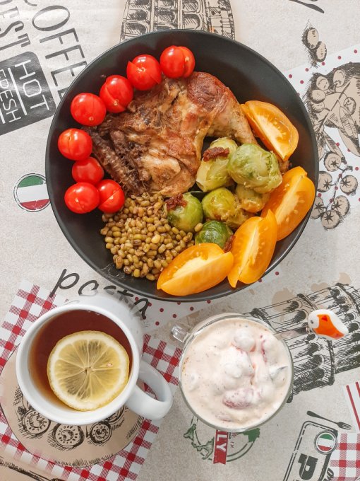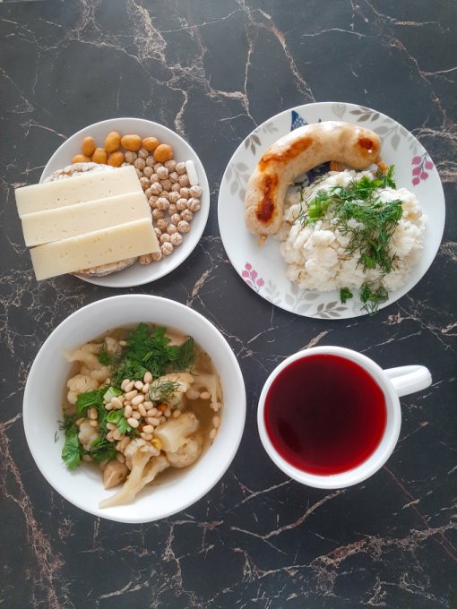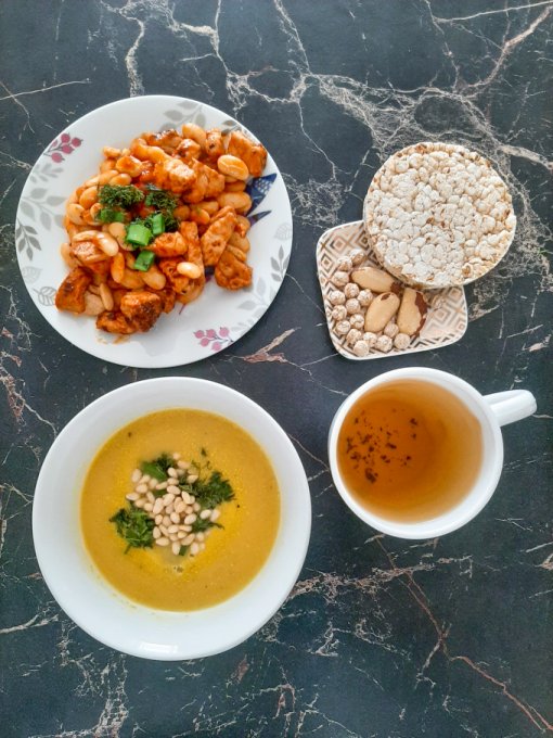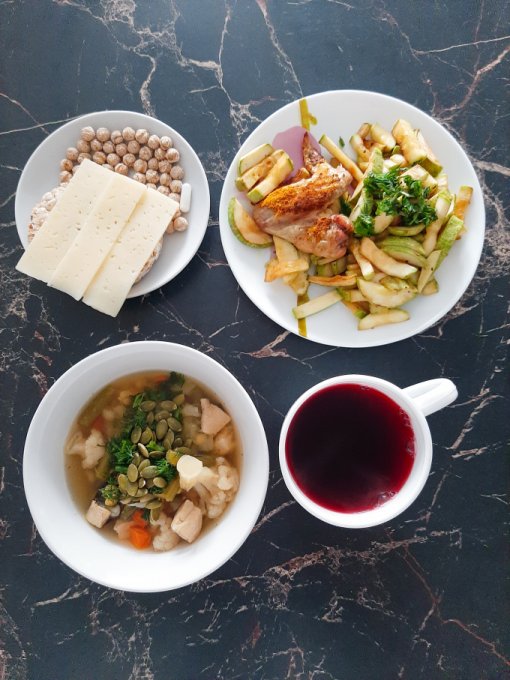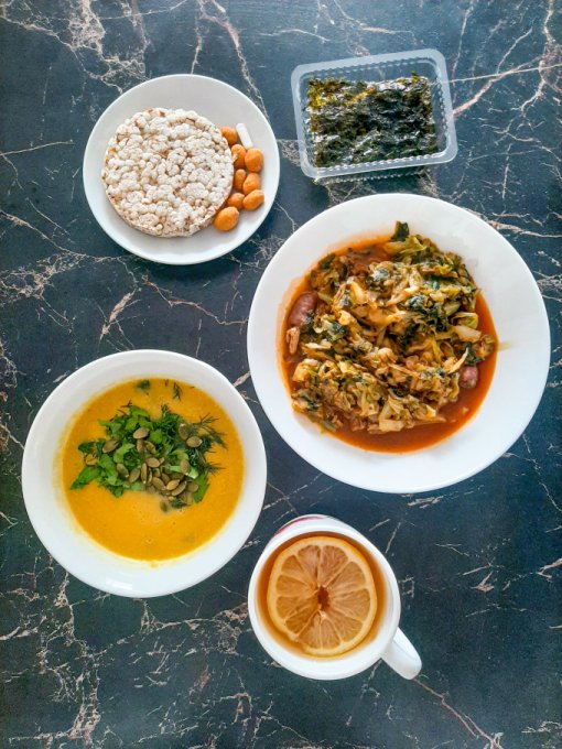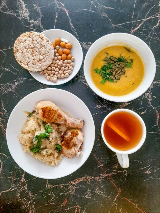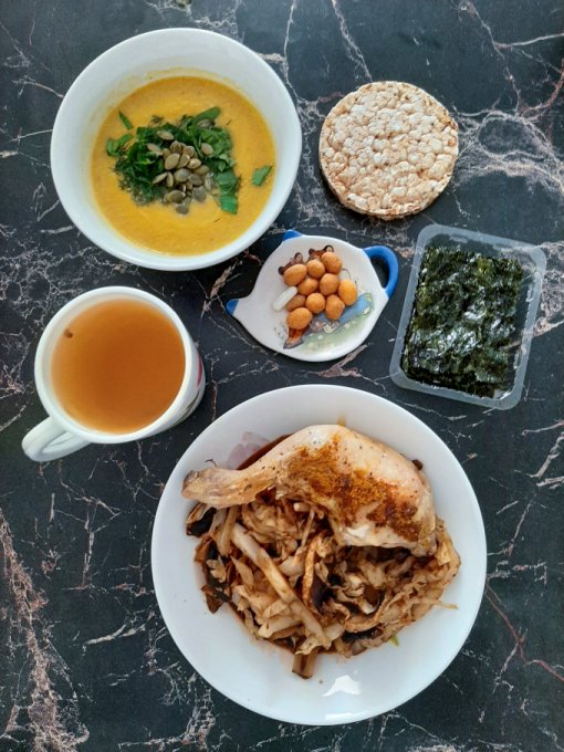 • На обед тыквенный крем-суп с морской капустой, тыквенными семечками и зеленью, куриный окорочок, пюре из цветной капусты с ряженкой и зеленью, чай с лимоном, арахис в глазури, лимонный хлебец, отруби.