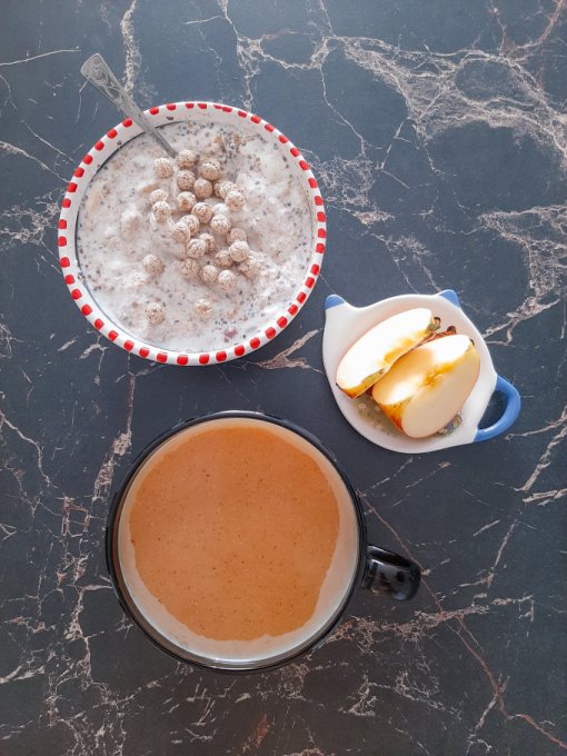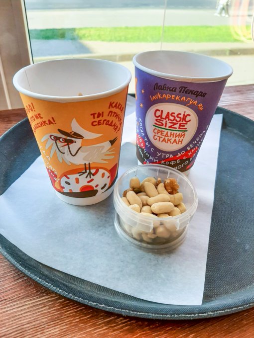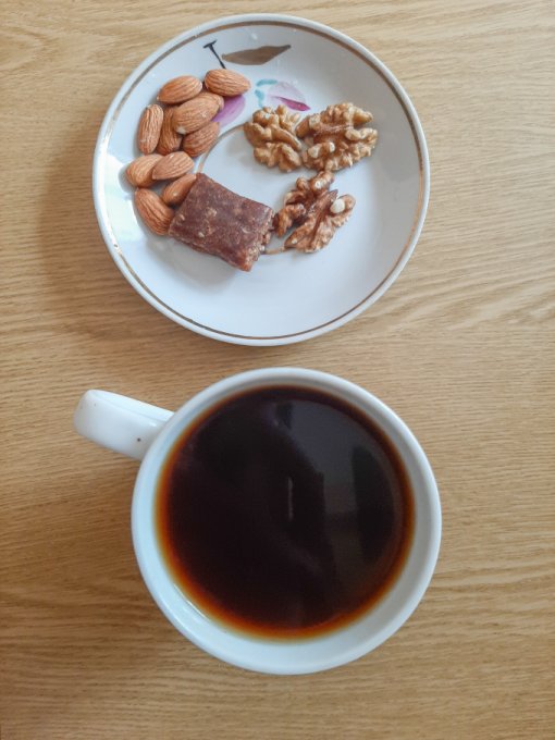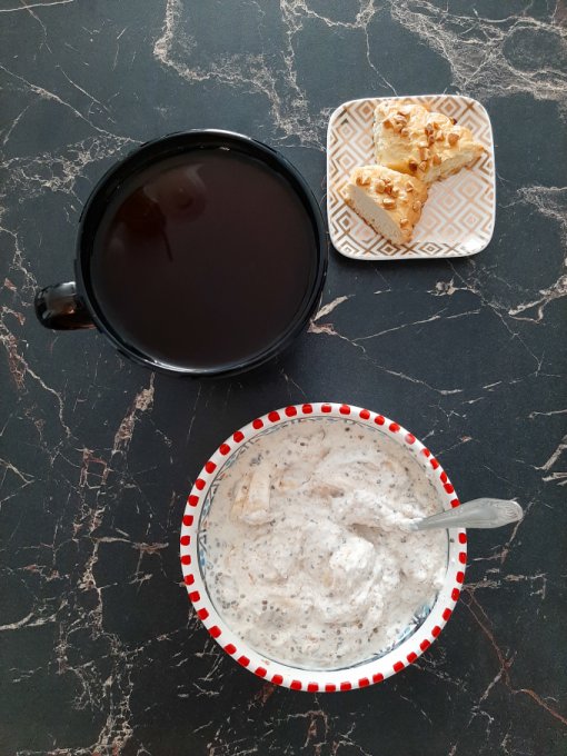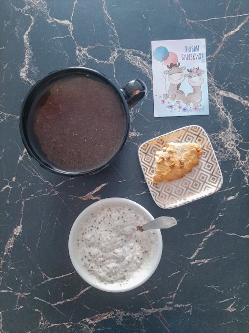 • На перекус кофе чёрный, мягкий творожок на ряженке с отрубями, семенами чиа, кокосовой стружкой, семечками подсолнечника, арахисом, песочное колечко с арахисом.