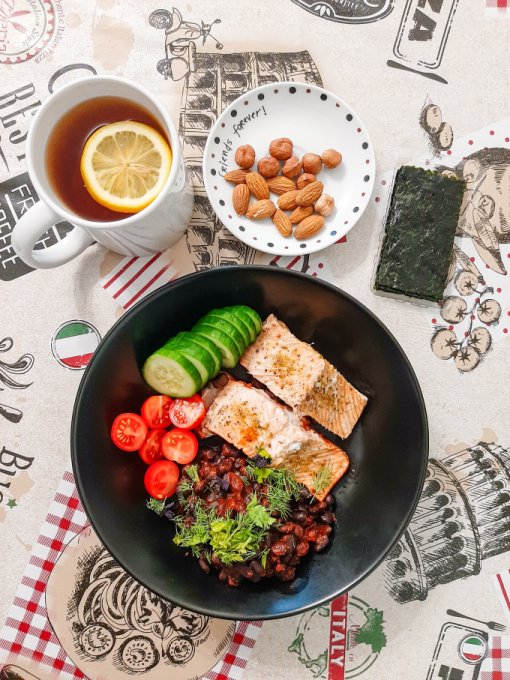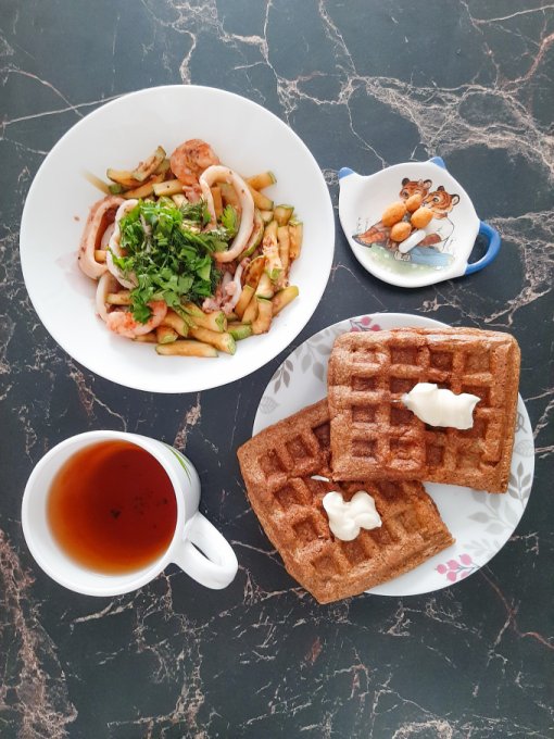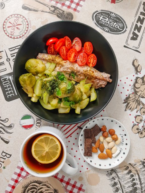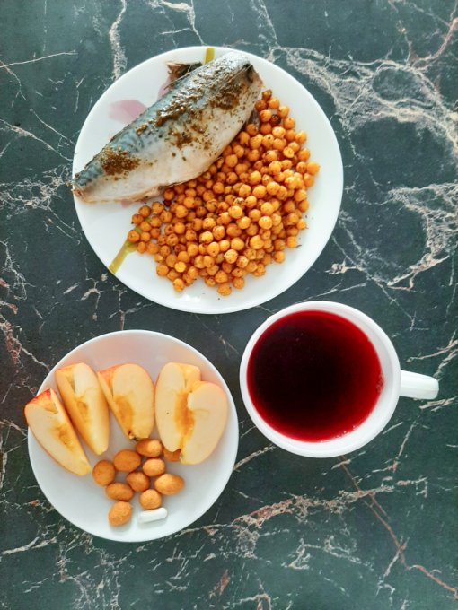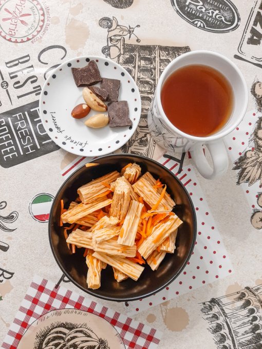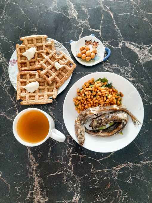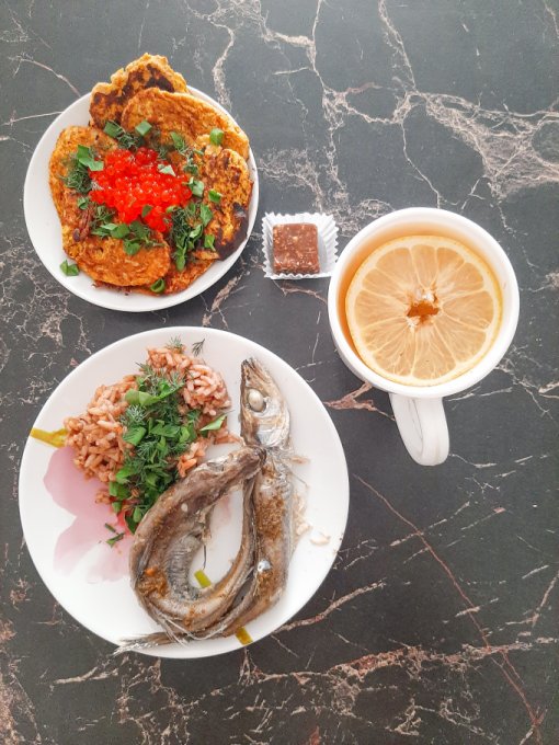 • На ужин путассу, рис с соевым соусом и зеленью, чай с лимоном, оладьи из тыквы с отрубями и имитированной икрой из морских водорослей, конфета из кешью и инжира.