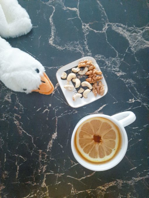 • На перекус чай травяной с мятой и лимоном, кешью, грецкие орехи.