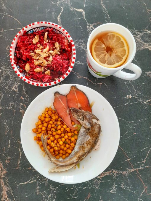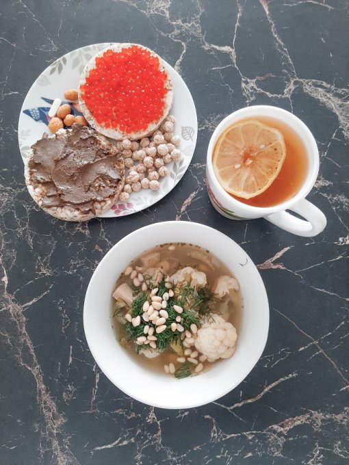 • На обед гороховый суп с морской капустой, зеленью и кедровыми орехами, чай с лимоном, отруби, хлебец с имитированной икрой из морских водорослей, хлебец с урбечом из расторопши.