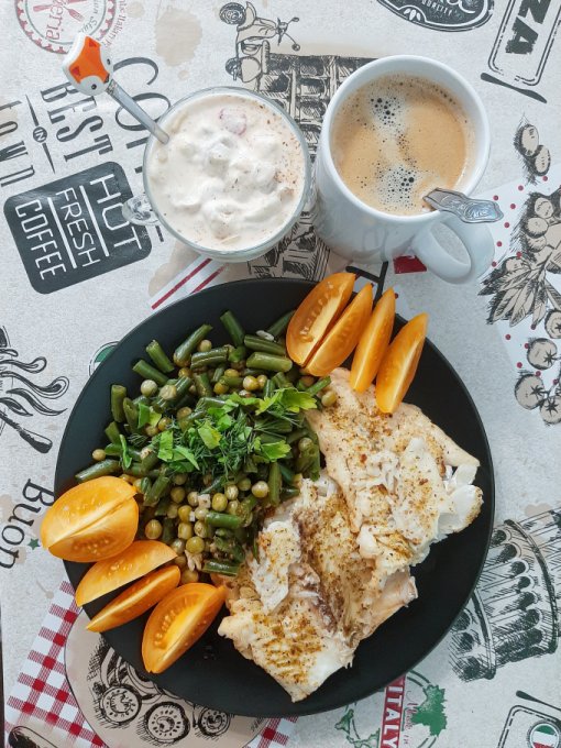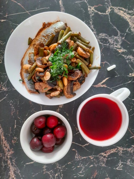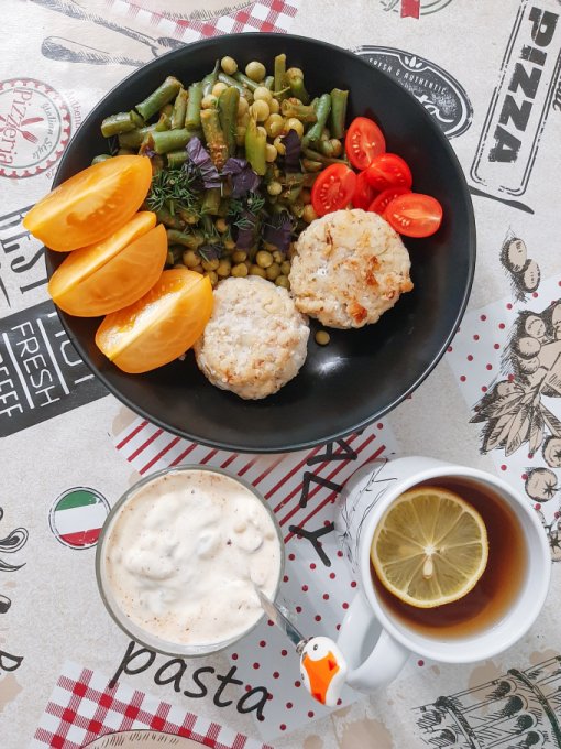 • На ужин котлетки из трески с луком, зелёный горошек, стручковая фасоль с зеленью, помидоры, чай с лимоном, мягкий творожок на ряженке с какао тёртым, миндалём, бразильскими орехами, кедровыми орехами, фундуком и тыквенными семечками.