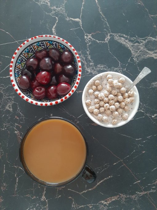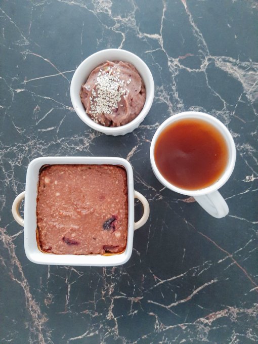 • На завтрак цикорий, мусс из авокадо с чёрной смородиной и кунжутом, творожная запеканка с кокосовой стружкой, мукой из полбы, черешней, какао-порошком, кефиром и 2 перепелиными яйцами.