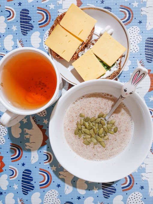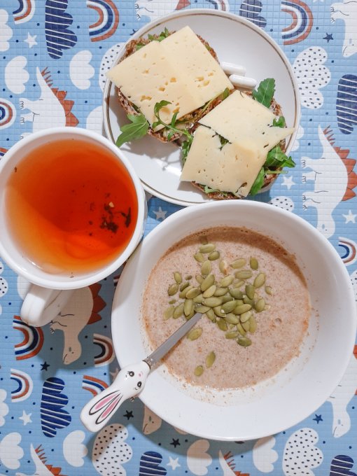 • На завтрак каша из льна и кунжута с добавлением тыквенных семечек, булочка Бородинская с сыром и петрушкой, чай.