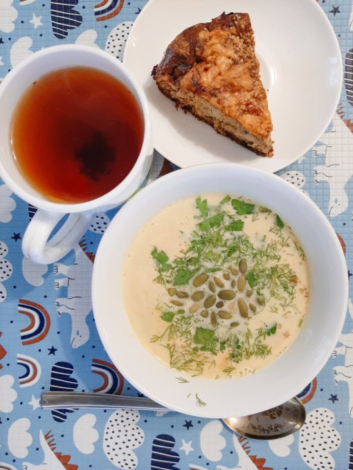 • На обед по традиции этой недели крем-суп из тыквы с беконом, тыквенными семечками и зеленушкой, заливной пирог с чаем. Суп доела, остался последний кусочек пирога. Это на завтра.