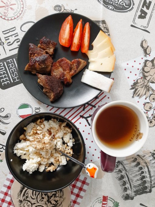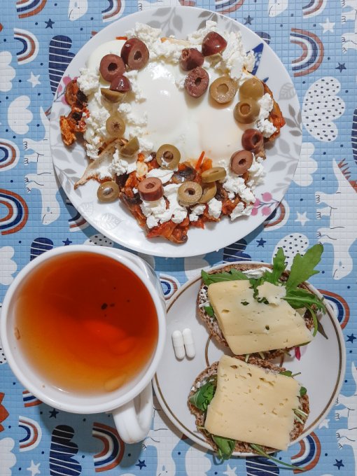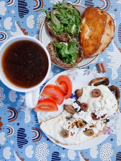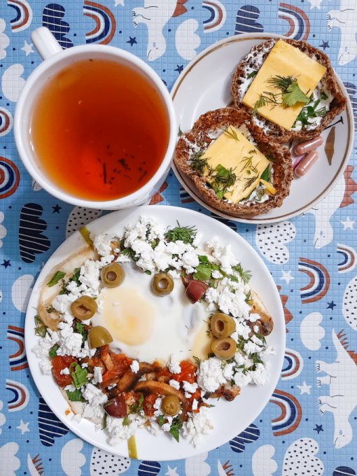 • На ужин приготовила второй вид греческого завтрака - коскосела коккини - в составе шампиньоны, помидор (нужно больше по задумке автора рецепта, но я не смогла позволить себе такой роскоши, берегу углеводы), 2 яйца, зелень, сыр фета, оливки, ещё была булочка Бородинская с сыром и петрушкой, чай. Завтрак во время ужина - идеально же! Подача, на мой взгляд, ресторанного уровня.