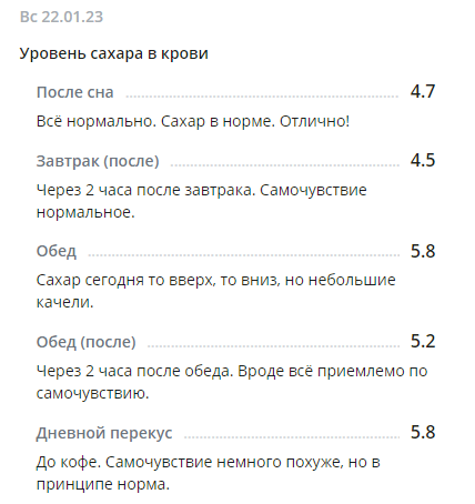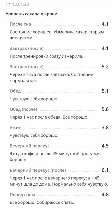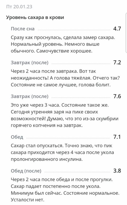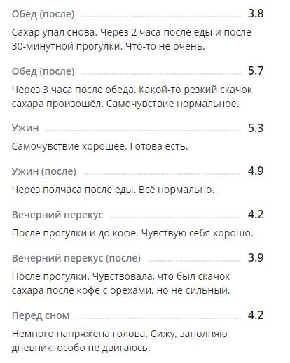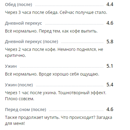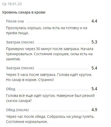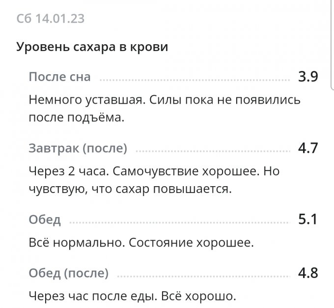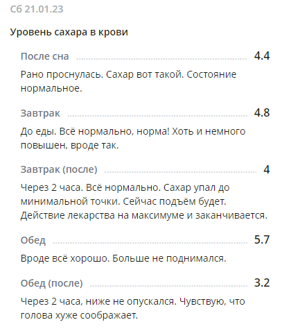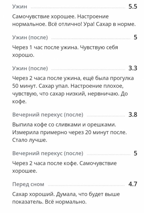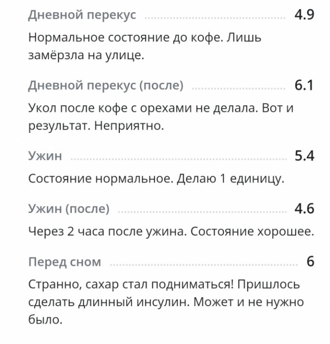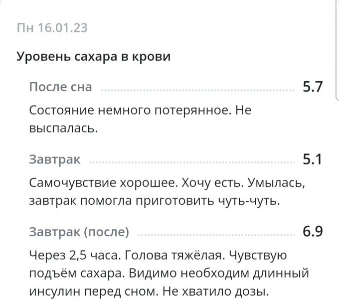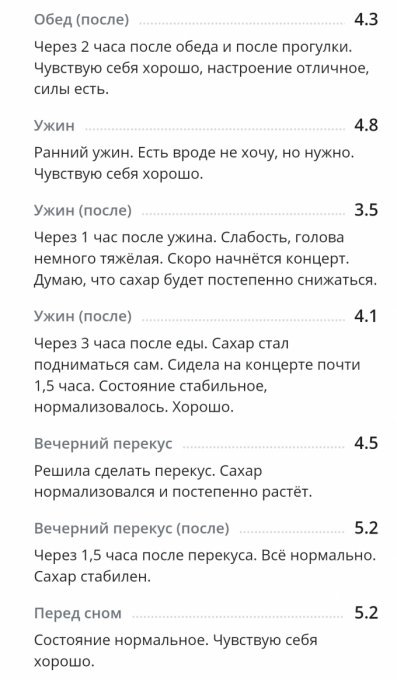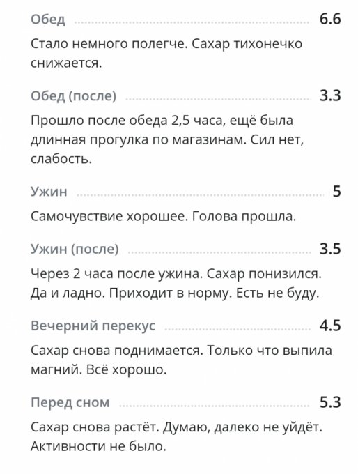 *С глюкометром новым вроде как разобралась по утру, подружилась. Понимаю теперь, что к чему и как сахар определять более верно. Получается, что будто на ощущениях записываю результаты. Вроде получается. Надеюсь, что сахар будет записан без особых погрешностей. Иногда сверяю с показателями старого глюкометра для большей уверенности.