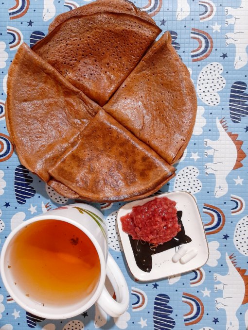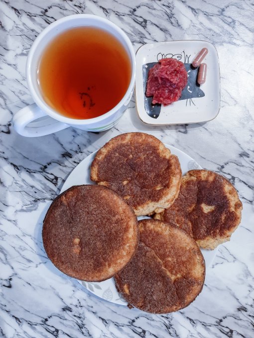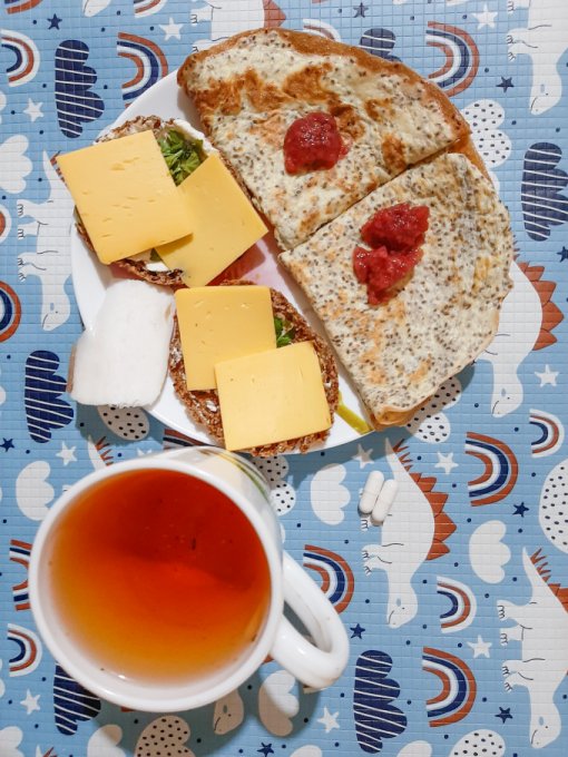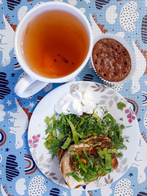 • На завтрак полное разнообразие: здесь и блинчики из чиа с малиновым джемом, и булочка Бородинская с сыром и петрушкой, и сало, и, конечно же, чай.