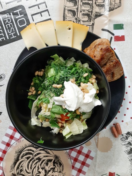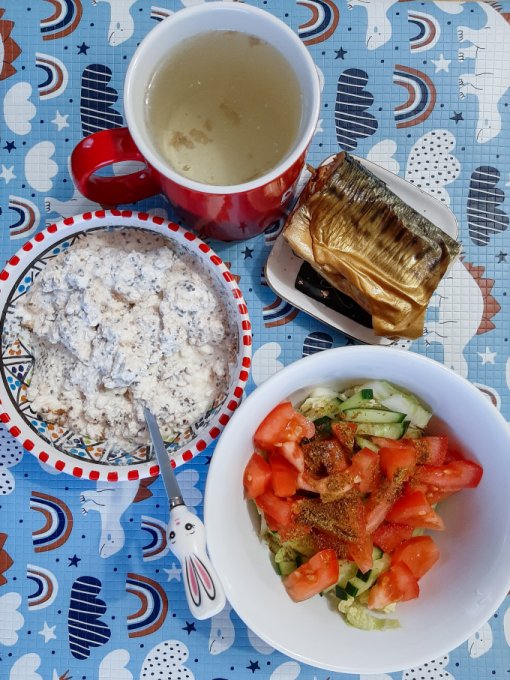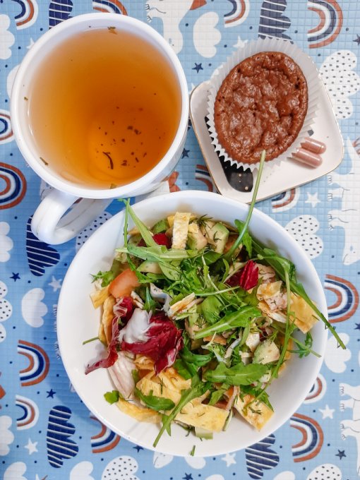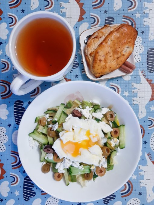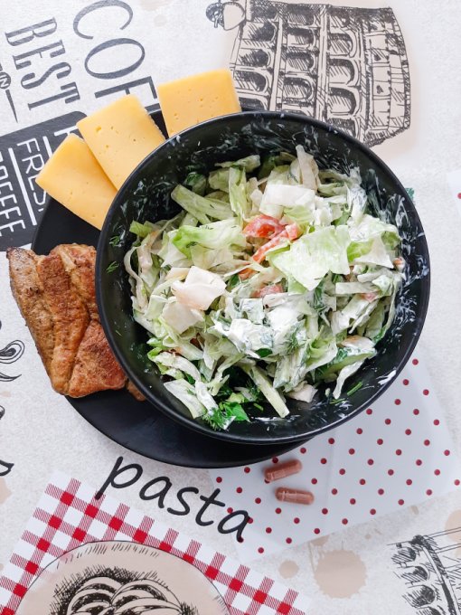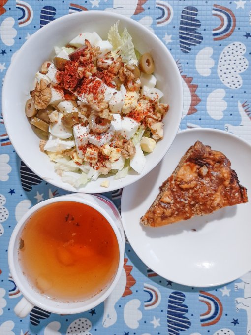 • На обед салат (айсберг, пекинская капуста, оливки, сыр фета, грецкие орехи, яйцо варёное, яблочный уксус, оливковое масло), пирог заливной, чай.