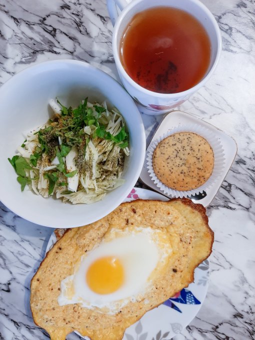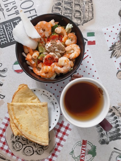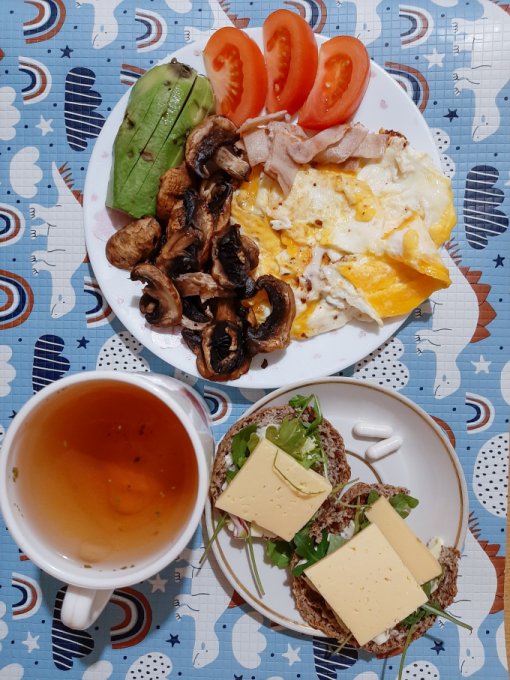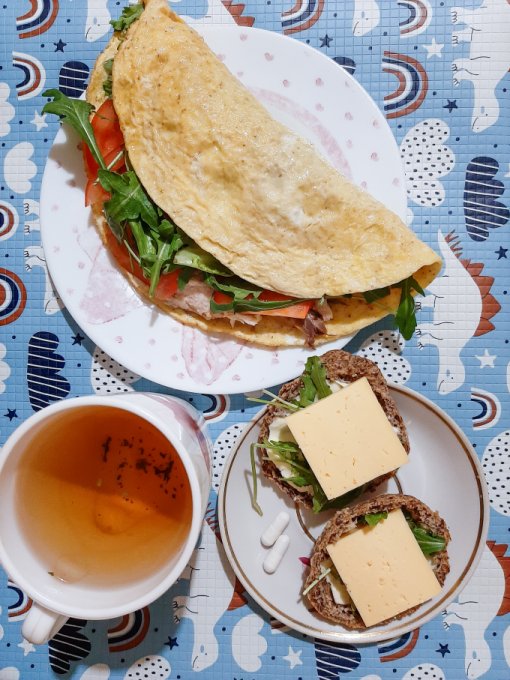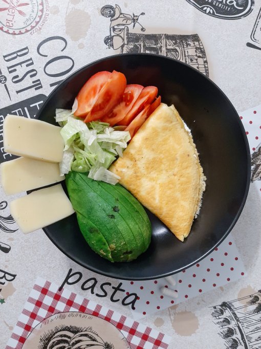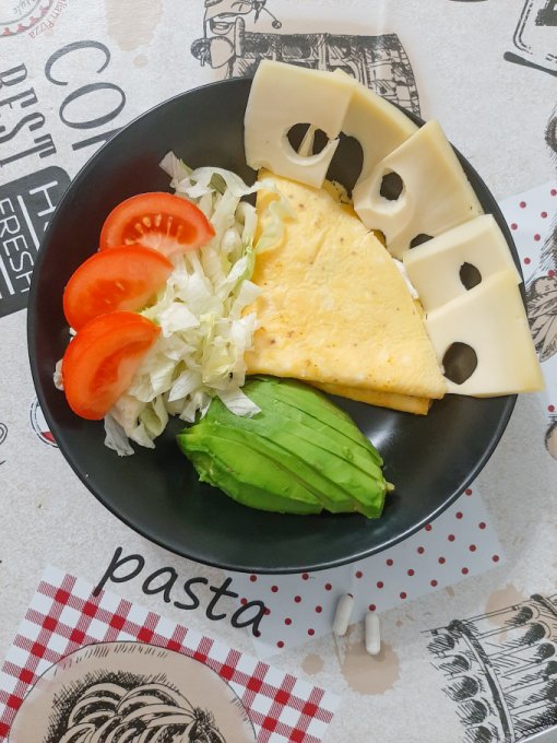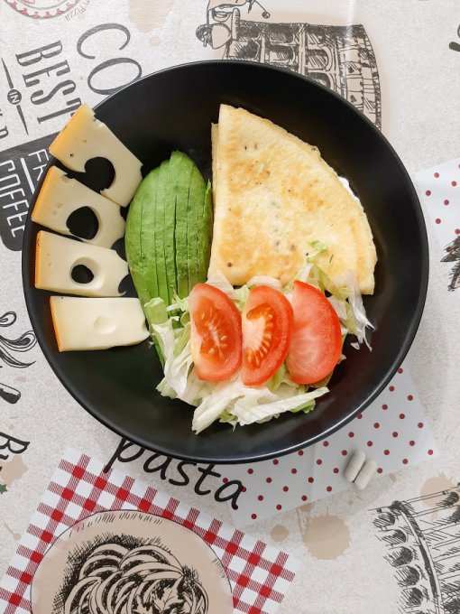 • На завтрак по традиции блинчик из 2 яиц с творожным сыром и зеленью, авокадо, айсберг, помидор, чай, сыр.