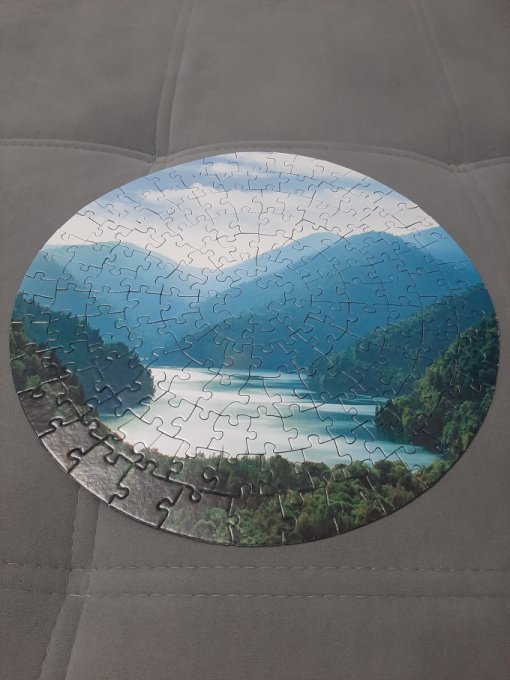 После ужина выполнили ещё одно задание - собрать пазл. Он был необычный, круглый, немного сложнее прямоугольного! Здесь нет углов, я обычно первым делом с них начинаю. Справились за 50 минут. Перед тем, как приступить к сборке, поспорили, за сколько времени соберём. Я сказала за час, Коля решил, что за полчаса. Я была ближе к истине. Получилась красивая картина. Коля хотел вставить её в рамочку и повесить на стену, но рамка не в размер, меньше. На картине горное озеро Рица в Абхазии на 150 пазлов. Это серия День/Ночь. Так что есть ещё где-то в тёмном варианте подобная картина. Для интерьера красиво.