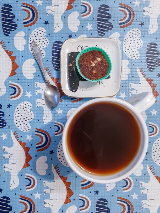 • На обед приготовили вместе пиццу на сковородке (тесто из 2 яиц со сметаной и сыром, начинка - бекон, свиная шея, томат, сыр, зелень) - разрезали пополам и съели, выпили кофе с дольками какао.