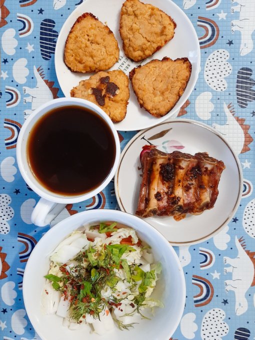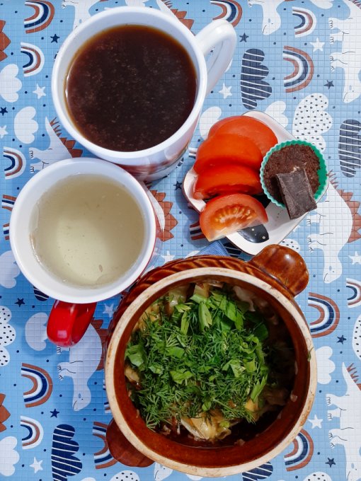 • На ужин свинина, салат овощной (помидор, айсберг, укроп, петрушка, сметана, кедровые орехи), кофе, сыр и долечка какао. У Коли новая клеёночка на столе.