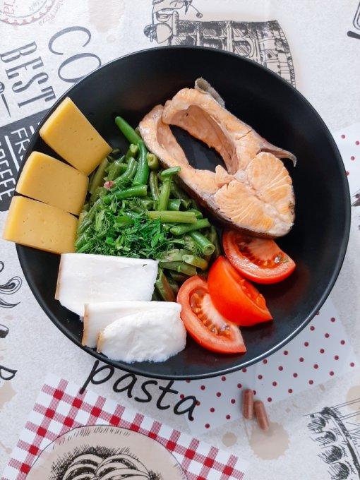 • На ужин ела томлёную свиную шею, салат (помидор, огурец, айсберг, зелень, сметана), чай, сыр.