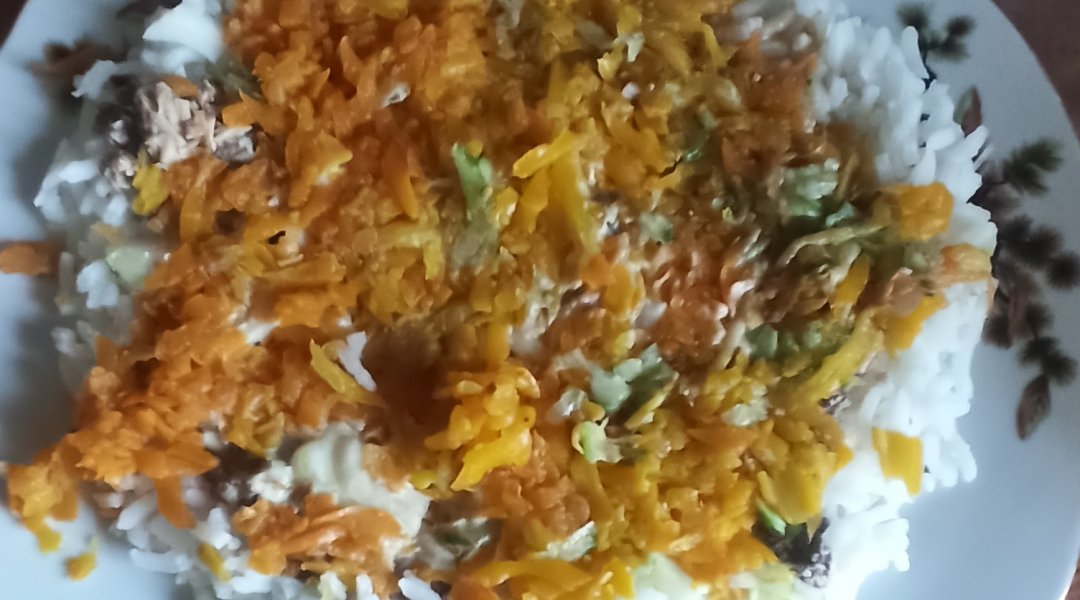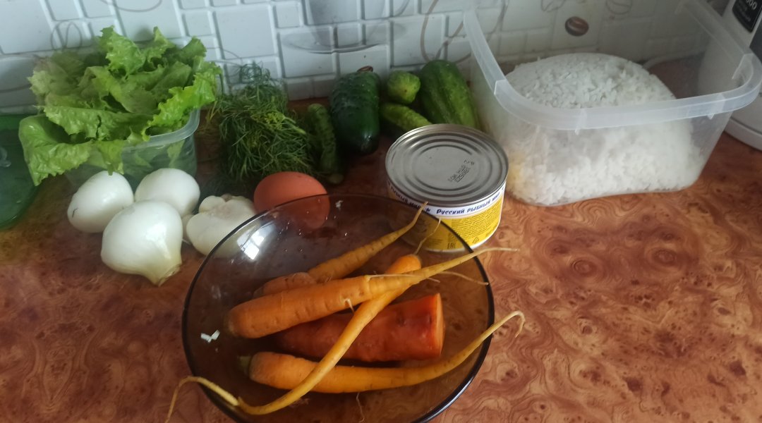Отварите рис, яйцо, морковь. Приготовьте ингридиенты согласно рецепта.